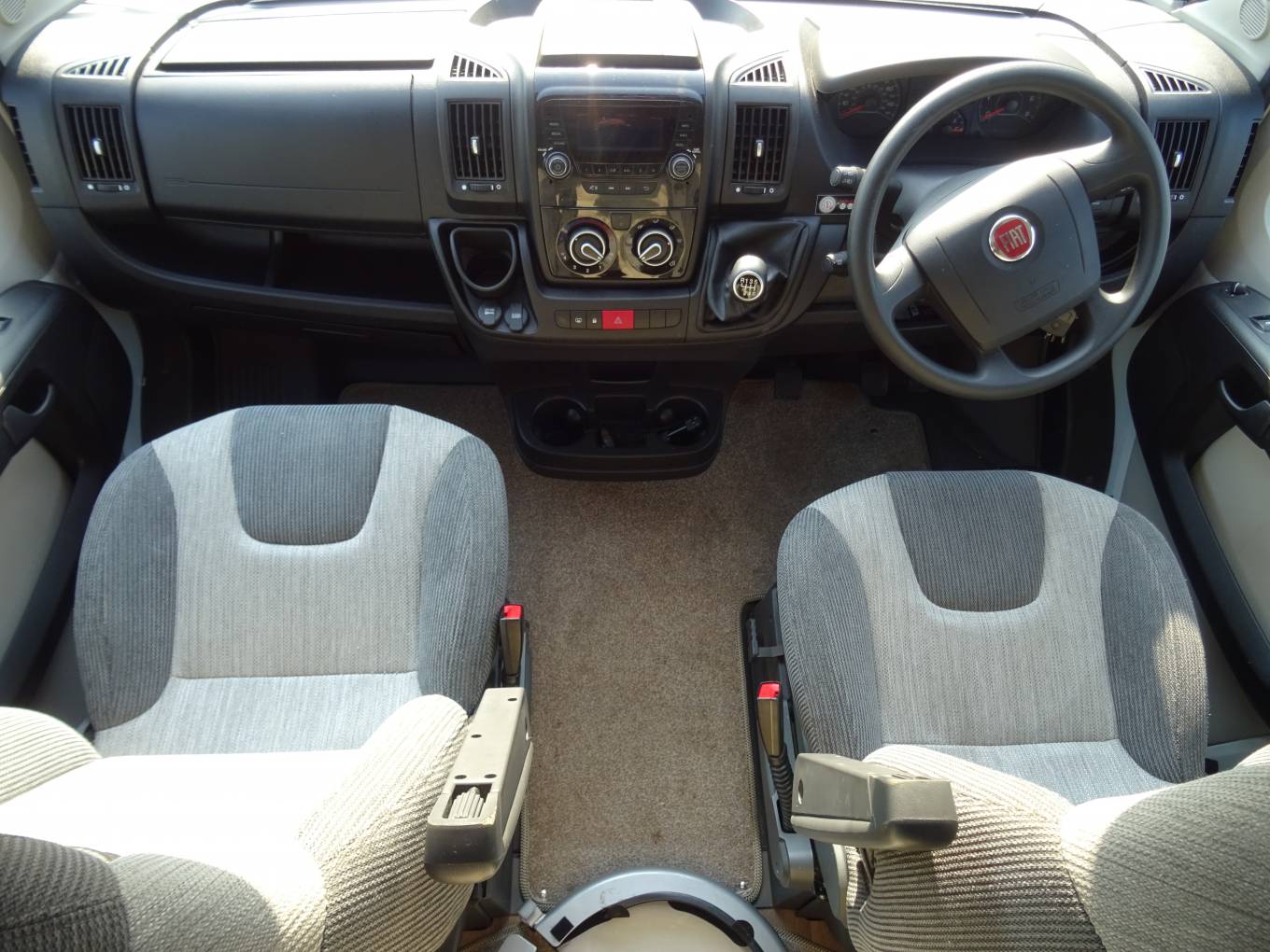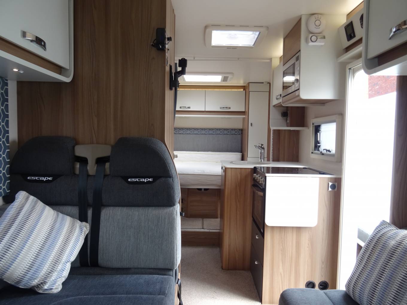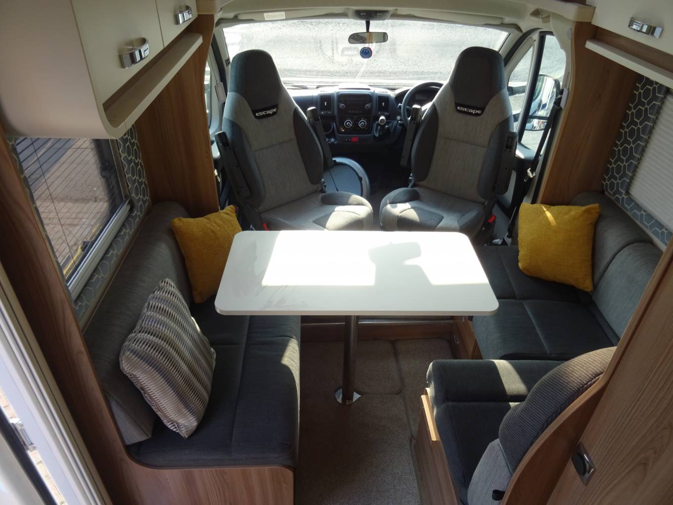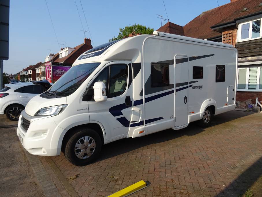 Swift Escape 694, 2018, just one owner, only 10,500 miles 4 berth and 4 seatbelts. It’s based on a Fiat Ducato with a 2.3 multi jet diesel engine. The rear bedroom has a fixed island double bed with a wardrobe either side of the bed and overhead lockers for storage., The modern central washroom features a toilet, vanity unit and hand basin, with shower and shower curtain. The mid 'L' shaped kitchen is very piratical and consists of a 3-burner gas hob with glass cover, kitchen sink, 230v built-in microwave, storage compartments and a fridge with freezer compartment. The front cab seats swivel round to make the front lounge/dinette area more spacious, also includes an island dinette table, this area can seat up to five people plus during the day, then at night the dinette area converts into a double bed.