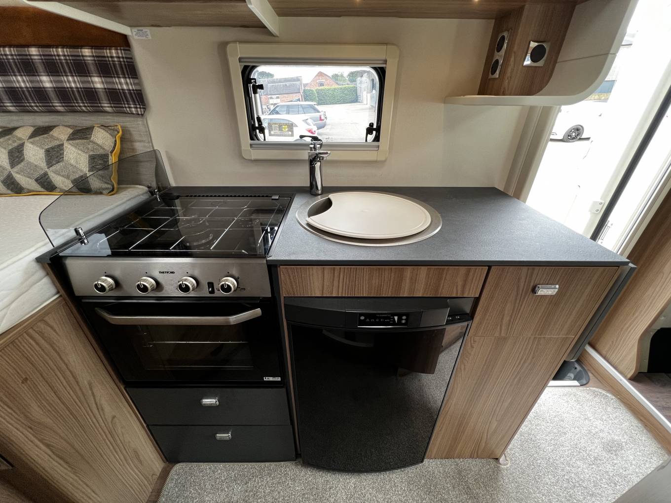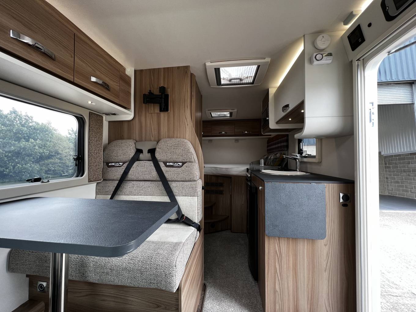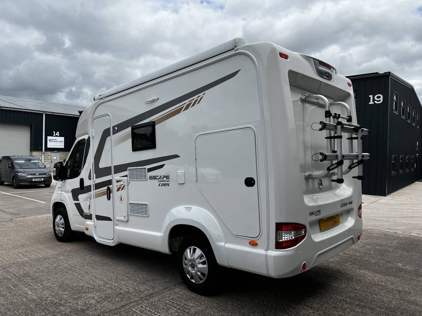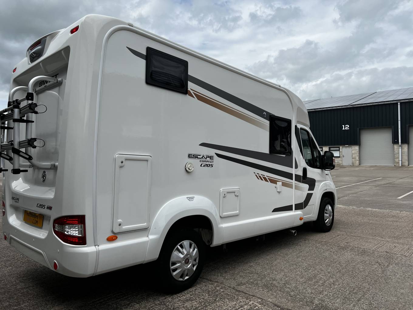Motorhome Depot Birmingham present this 2020 Swift Escape Compact C205 based on a 2.3L Fiat Ducato with 6-speed manual gearbox. Upon entering through the habitation door, you are greeted with a centre dinette with removable table, 2 additional traveling seatbelts and swivel seats, moving towards the rear of the motorhome you have a well-equipped kitchen which features a 3-ring gas hob, microwave, oven, grill, sink with mixer tap and a 3-way fridge-freezer. Adjacent to the kitchen is a functional washroom with toilet cassette, sink and shower. Moving further to the rear of the motorhome there is a generously sized fixed transverse bed above a good sized rear garage. Extra's include thule bike rack full winter cover