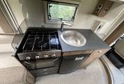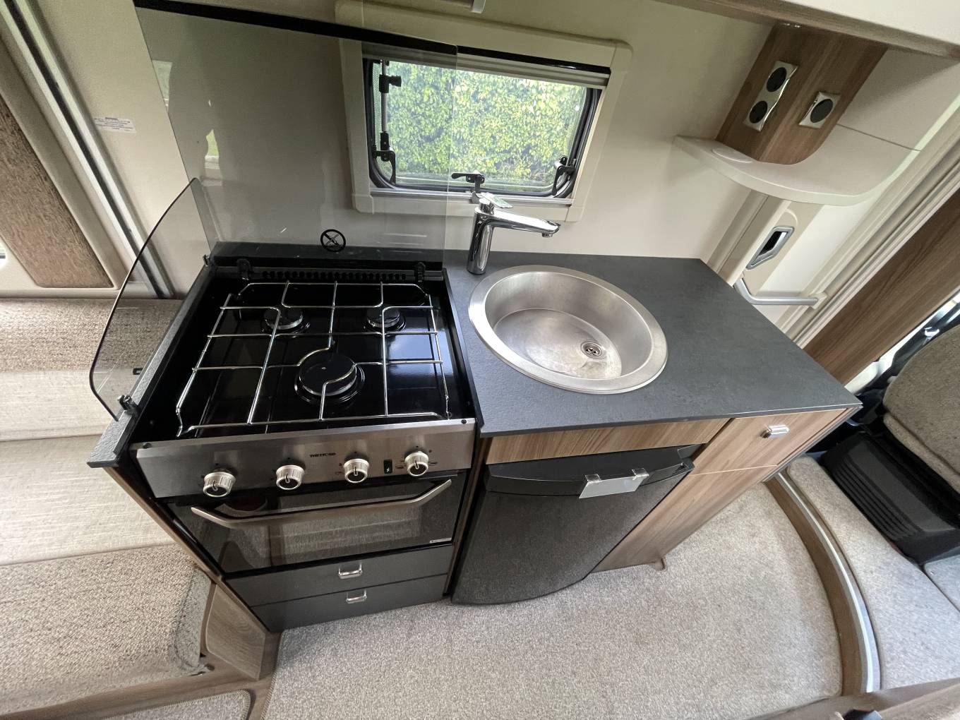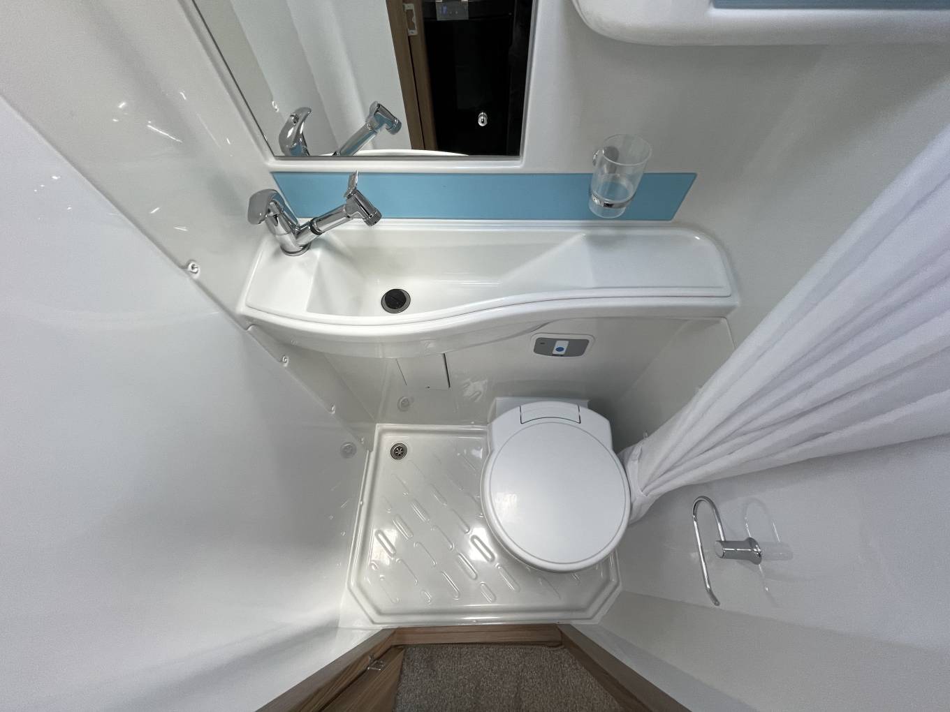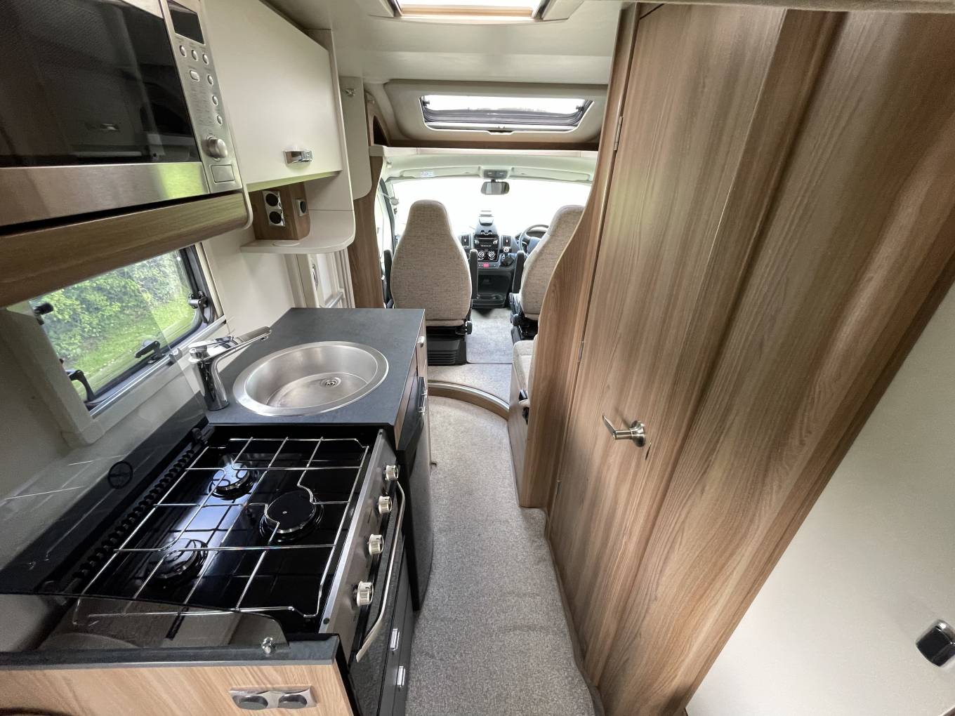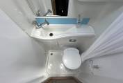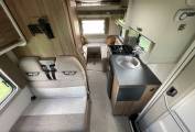 It features a rear pull down double bed which is handy as the bed can be made and tucked out the way. Below is the rear lounge. This is the perfect place to relax and can convert to a comfortable double bed. Next is the washroom, complete with toilet, wash basin and shower. Opposite the well equipped kitchen, which includes and microwave, oven, grill, gas hob, wash basin and 3 way fridge. To the front is the cab and 2 more travelling seats with belts.
