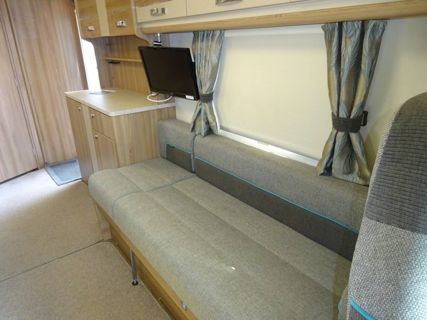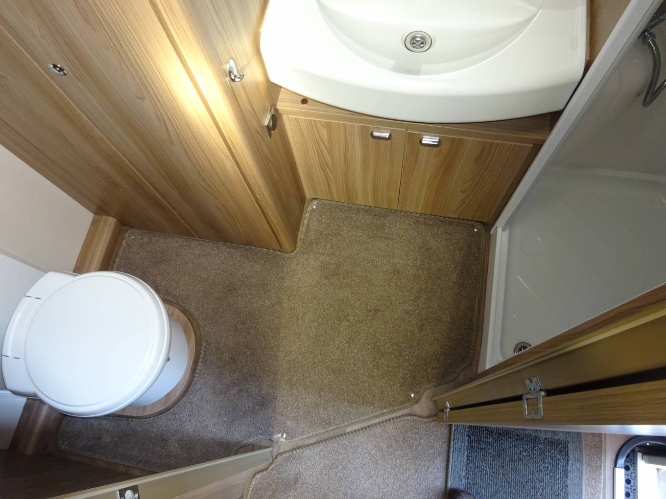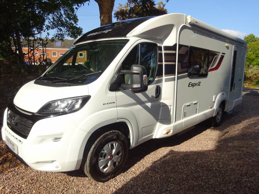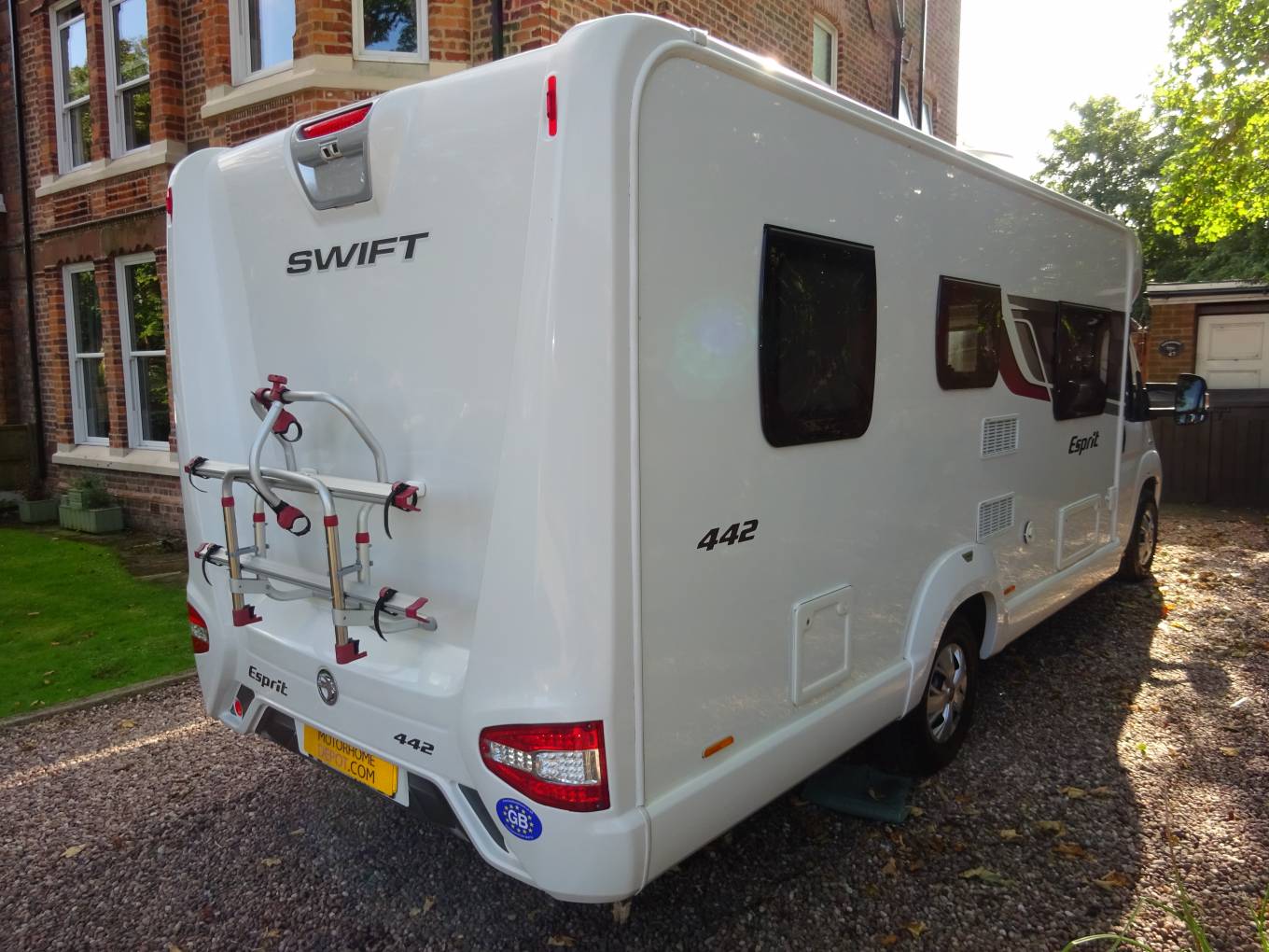 MotorhomeDepot.com has for sale this 2015 (15 reg) Swift Esprit 442 a low profile coach built motorhome that offers comfort and generous space for two. The interior of this motorhome is immaculate. The layout is end washroom, kitchen amidships and a spacious lounge area at the front. Each sofa can be used as a single bed with minimal effort. As beds they measure approx 6'2" long by 2'4" wide. The double bed is simple to make up. Just slide out the support slats from under each sofa to meet in the middle to make a transverse double approx 6'8" by 4'8". The kitchen is very spacious with the sink, duel fuel hob, gas grill & oven, microwave and fridge with freezer compartment all on the drivers side there is a large flat work top on the passenger side with more cupboards underneath. Low energy lighting throughout includes dimmable spotlights, ambient over locker lighting, inside the upper lockers, low level night lights and an illuminated kitchen splash back. TV included. Esprit models achieve Grade 3 standard for heating and thermal insulation making them suitable for year round use. Winter pack fitted as standard. The spec is too much to list. A scan of the brochure is available along with a video of the interior on request. The washroom is notable for its size, going across the width of the motorhome at the rear. The shower cubicle is separated by folding doors. Washbasin has cupboard below and large vanity mirror above. The Thetford C260 toilet has electric flush. In the offside corner we have a large wardrobe with good hanging space and shelving.