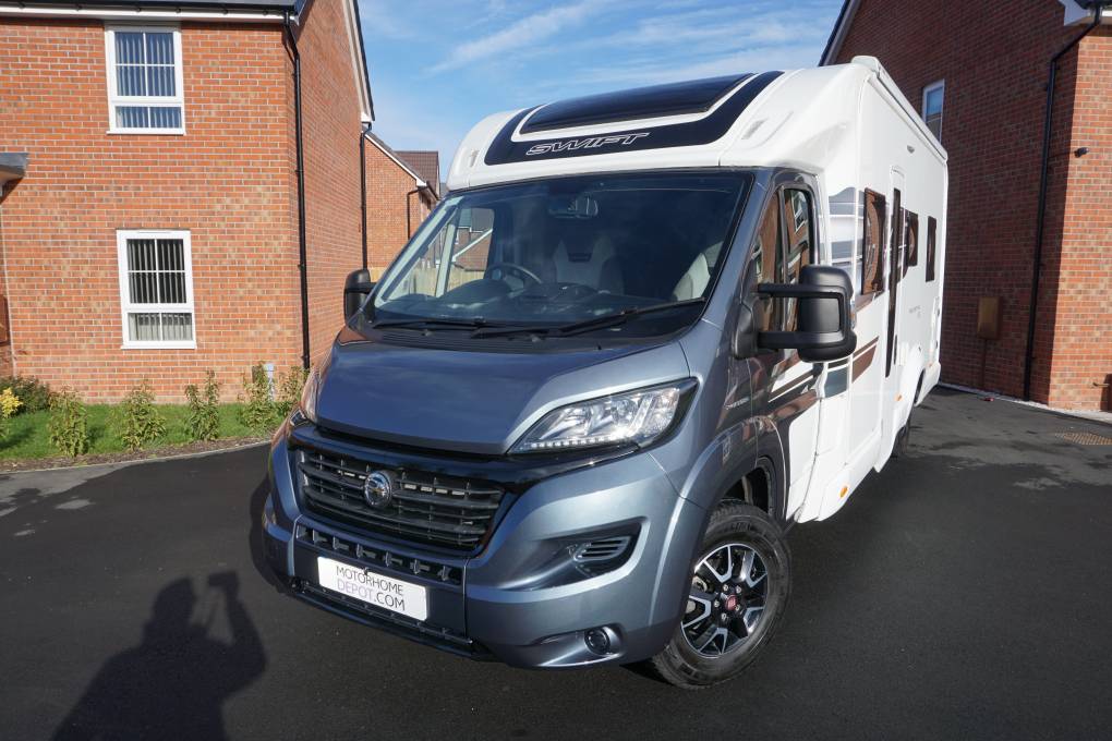 The bodywork uses Swift’s latest SMART Plus timberless-framed construction with new GRP balanced panel side walls. The overcab pod features an opening sunroof, while the cab itself is painted in dark grey metallic with a colour-coordinated bumper.