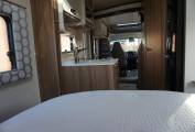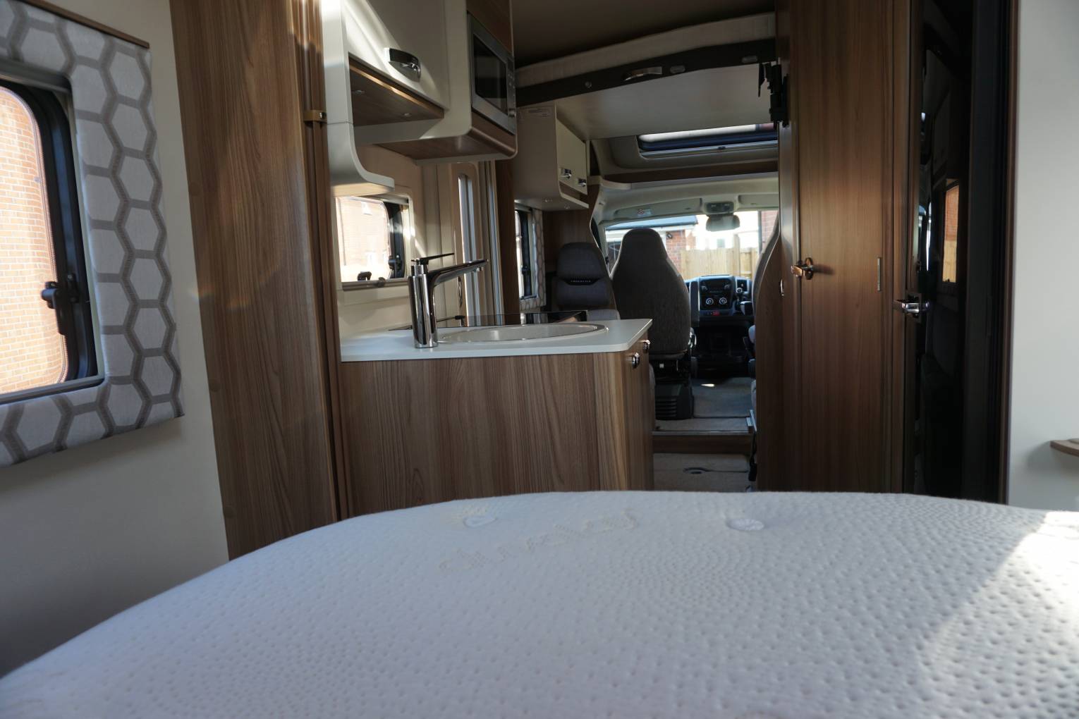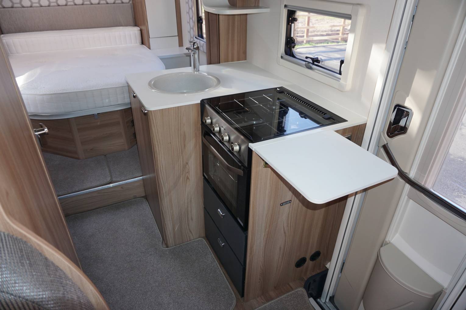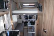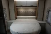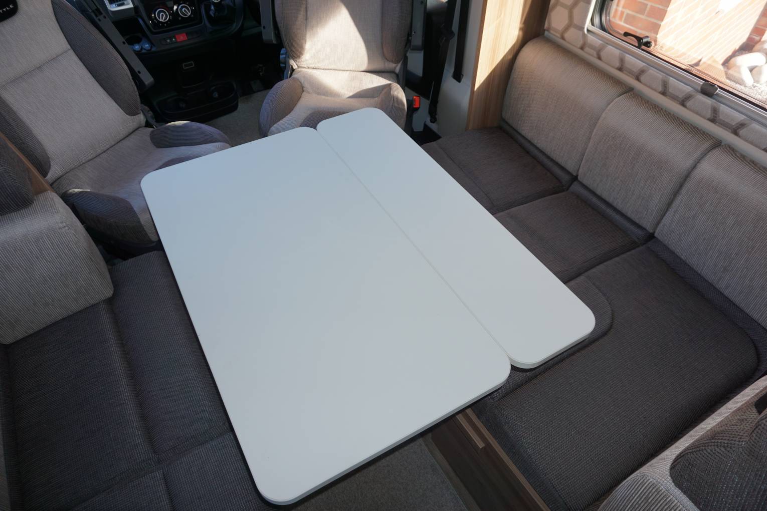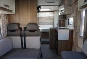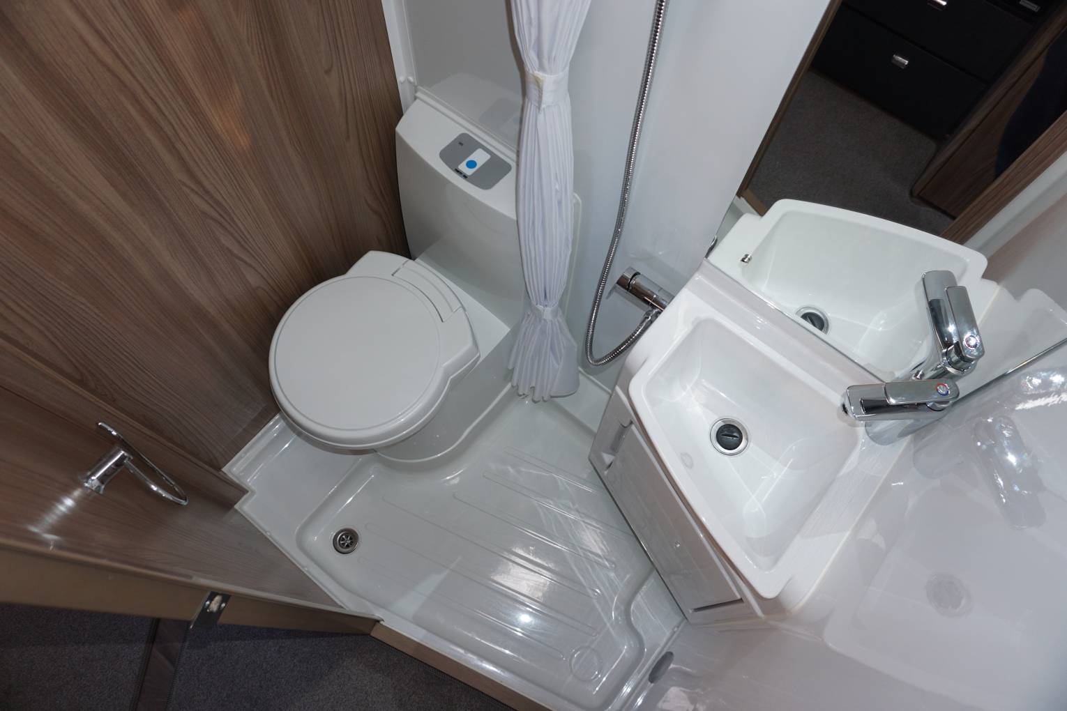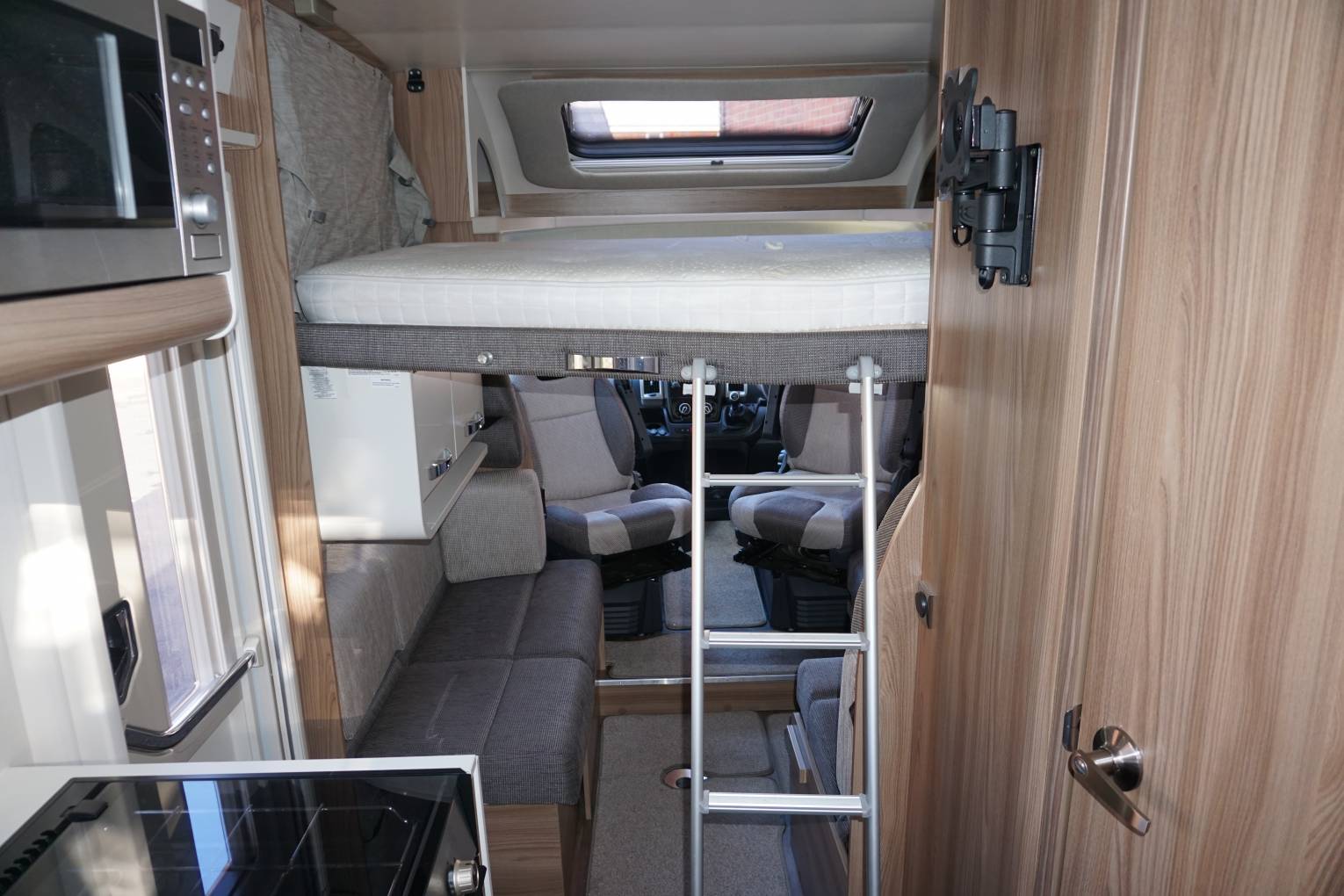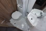 This 694 model also comes with an optional drop-down double bed over the front lounge (plus a fifth belted travel seat, rearward-facing), Combi 6 gas/electric heating, a combined oven/grill and slim-tower fridge and a microwave. The compact washroom is an all-in-one design, including a shower.