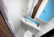The washroom is modern and bright and is fitted with a Thetford electric flush toilet with an overhead shower, vanity cupboard and large fixed mirror and sink.