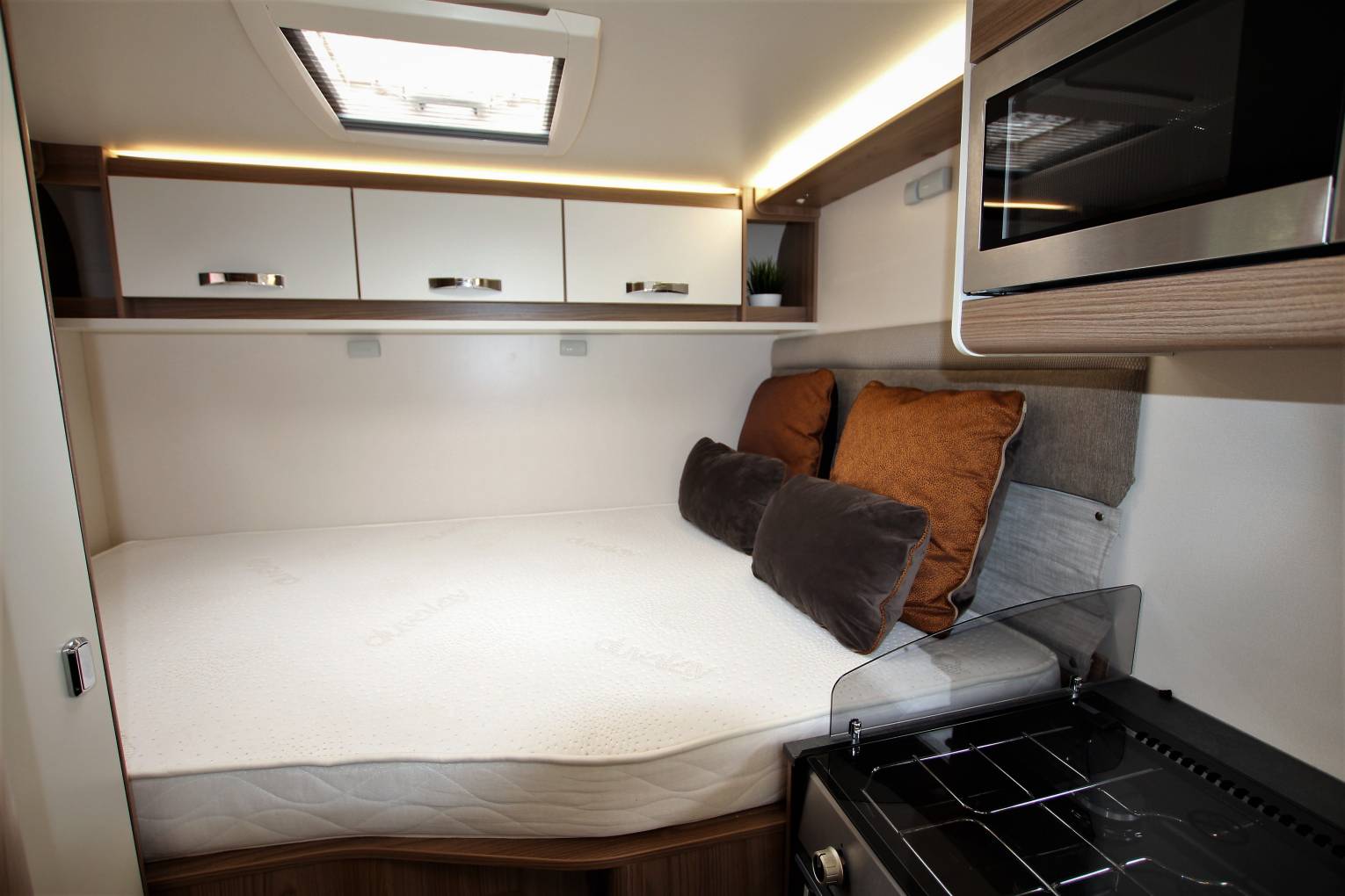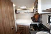 The living area in a soft oatmeal upholstery, grey worktops makes for a relaxed living space, the fixed double bed over the ample garage measures a standard size (194m x 131m) there is an abundance of over head lockers and a small wardrobe, a freestanding table. The kitchen is equipped with an oven/grill, 3 gas burners, sink, over lighting, plenty of plug sockets, and a digital aeriel. The 3 way fridge has a freezer compartment. There are removable carpets included in brand new condition. 4 travelling belts are fitted. The dinette area can make to a small single berth bed (pictured) or would sleep perhaps a small child.