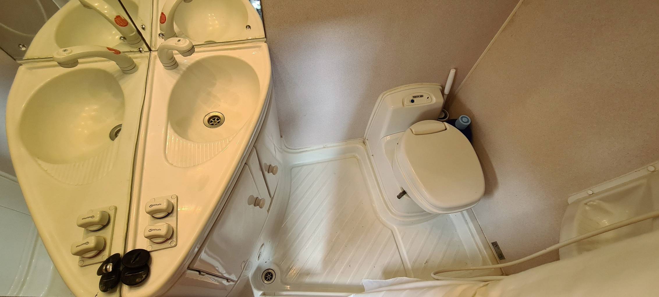 Moving forward you will find the washroom, with a full vanity style washbasin, separate shower tap and an electric flush toilet, mirrors surround the room with further storage cupboards above.