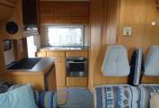 The kitchen is fully kitted out at the rear of the motorhome with sink and gas burner set up, all working as it should.