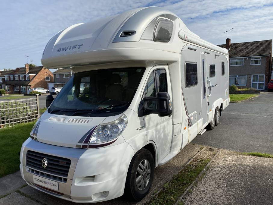 This top of the range Swift Kon-Tiki 669 Sleeps Six, has Four Seatbelts, is 8.7m long and has a gross weight of 5000kg.