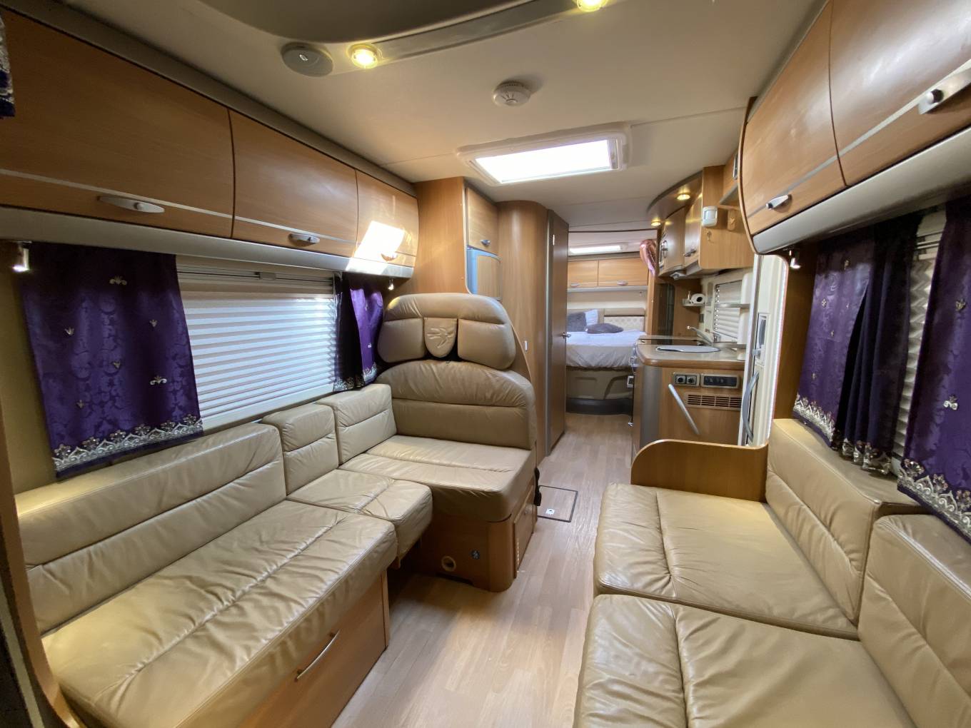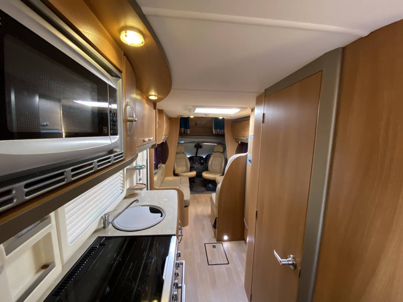 On entering via the habitation door, to your left is the full leather lounge with twin inward facing settees where on the driver’s side a section can be moved to use the forward facing belted seats. Twin swivelling Cab seats complete this very comfortable lounge easily accommodating six or more round the removable dining table.