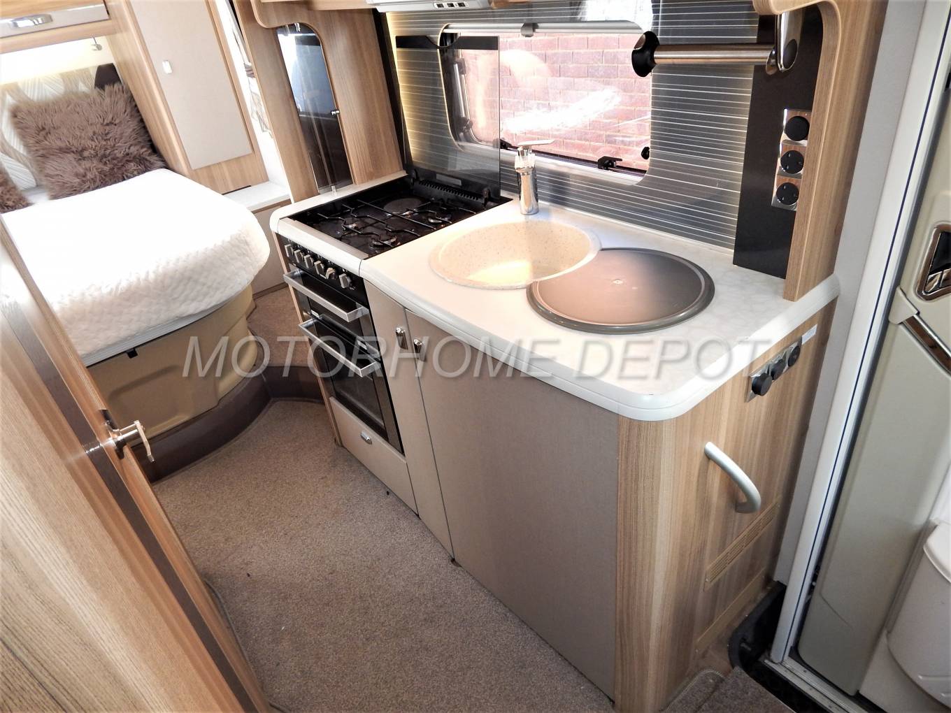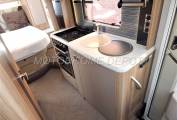 To the right of the habitation door is the Kitchen area which comprises of a good work surface with a round bowl style sink and chrome mixer tap. The fridge with separate freezer is opposite and is a large Dometic 3 way absorber unit that can be powered by; 240v,12v or gas depending whether you are plugged in on site or wild camping. There is a full oven and grill with a dual fuel hob comprising of a 240v hot plate and 3 gas burners. overhead there is plenty of: locker space; a microwave; & 12 volt extractor.