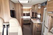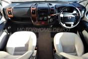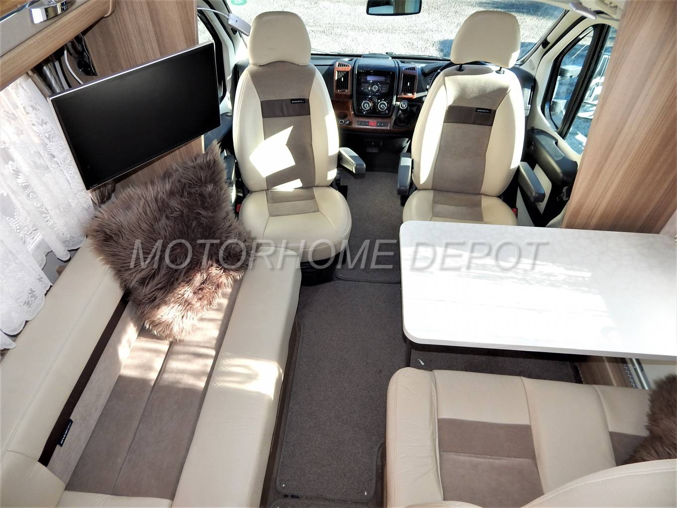 We enter the motorhome via an electric step immediately to the left is the dinette which consists of a 2 seater side sofa and a half dinette with a forward facing 2 seater sofa with 2 x 3 point seat belts for travelling passengers and a fixed table. The front two seats rotate to join this area so you could easily seat 6 people if entertaining on site. At night this area makes up into a double bed by dropping the table down and using a combination of sofa cushions and infills. There is a TV point and large flat screen Avtex TV for all your holiday viewing.