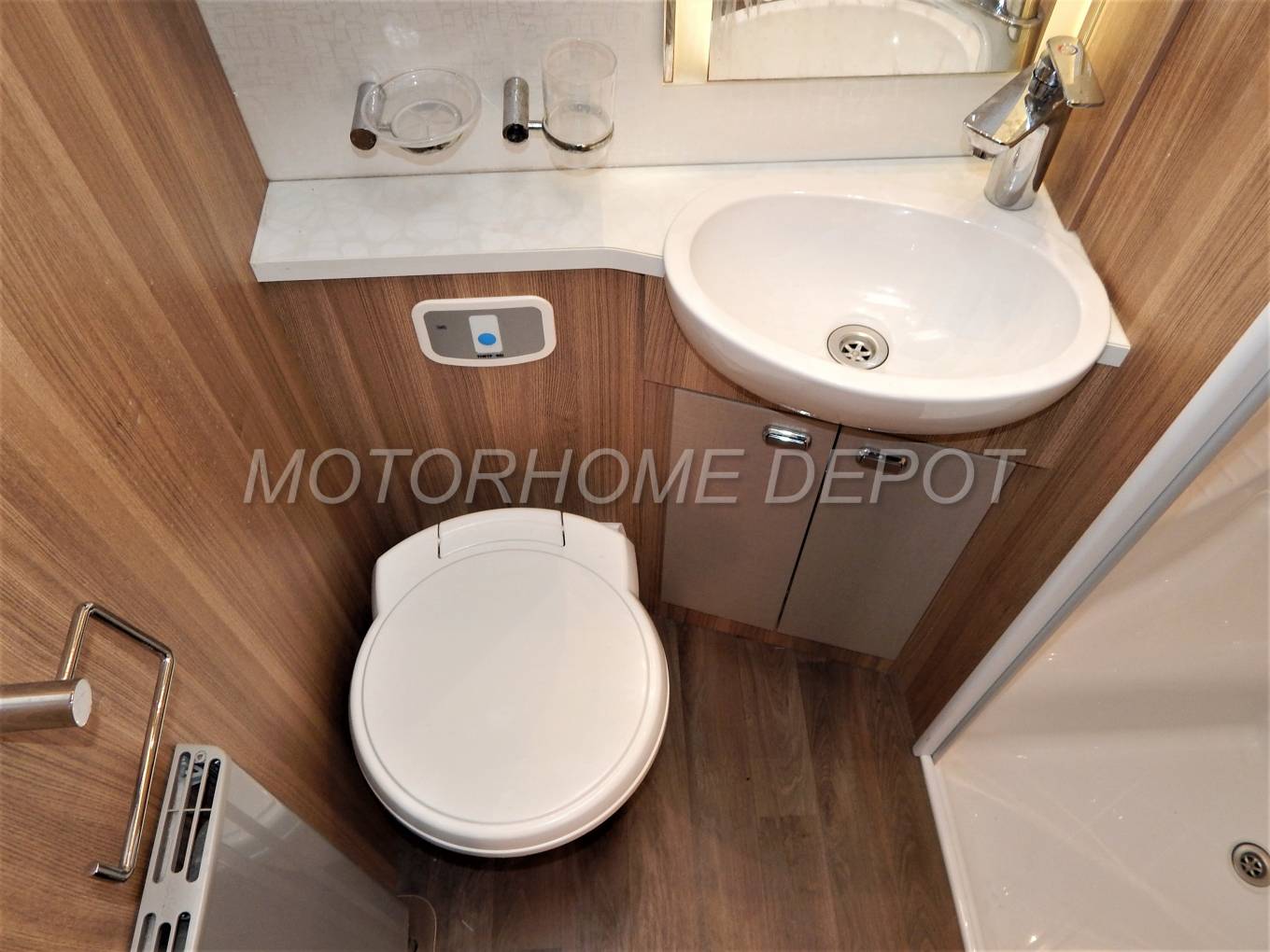 Opposite is a large bathroom which has a Thetford fresh water flush toilet, built in wash hand basin with chrome mixer tap and vanity unit. The shower separates from this area completely with the use of perspex doors it has a chrome mixer and shower head on a chrome riser.