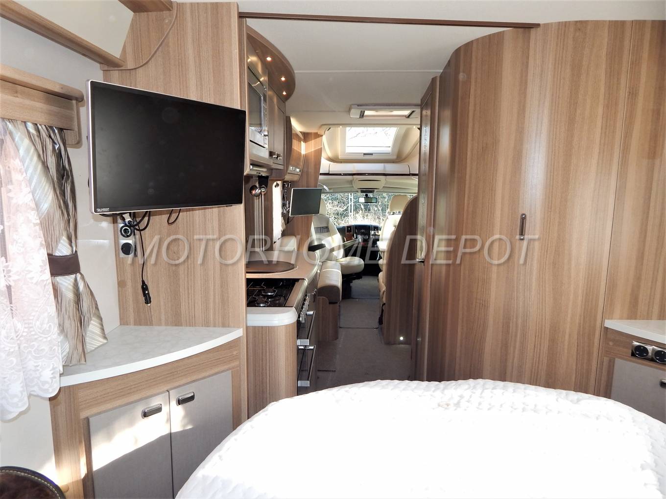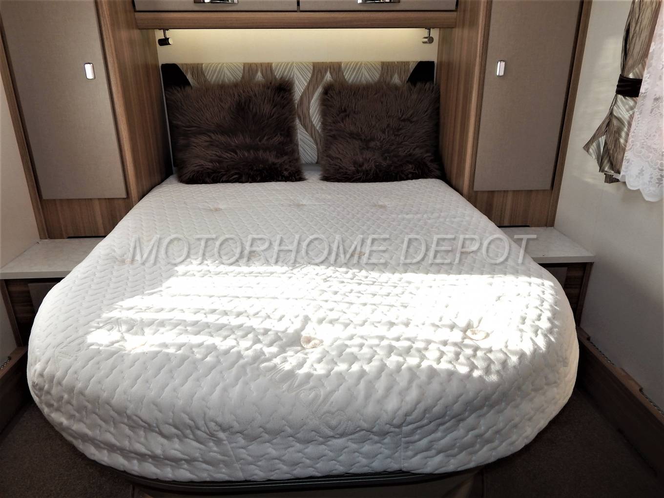 To the rear is the main bedroom which has a sumptuous island bed, it can be sectioned from the habitation area with a sliding concertina blind. There is an additional tv point with the second of the two large Avtex tv’s. there is hanging wardrobe space either side of the bed with locker access underneath to the rear garage area.