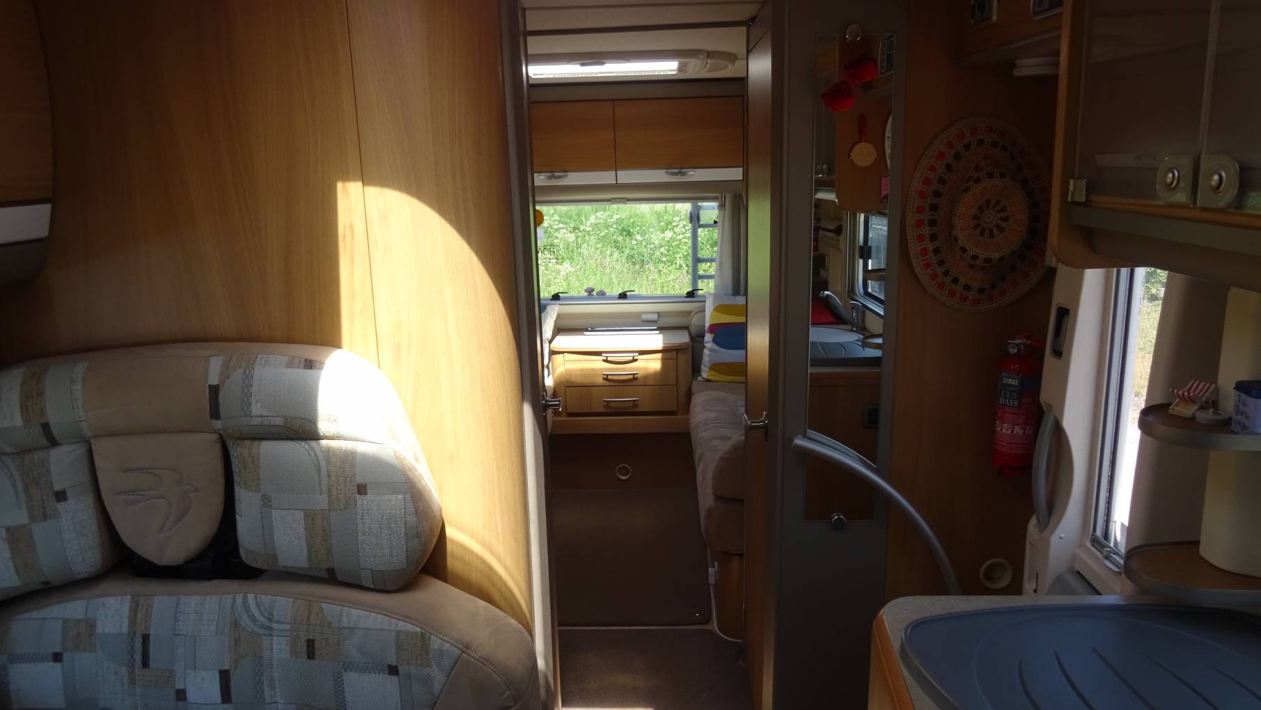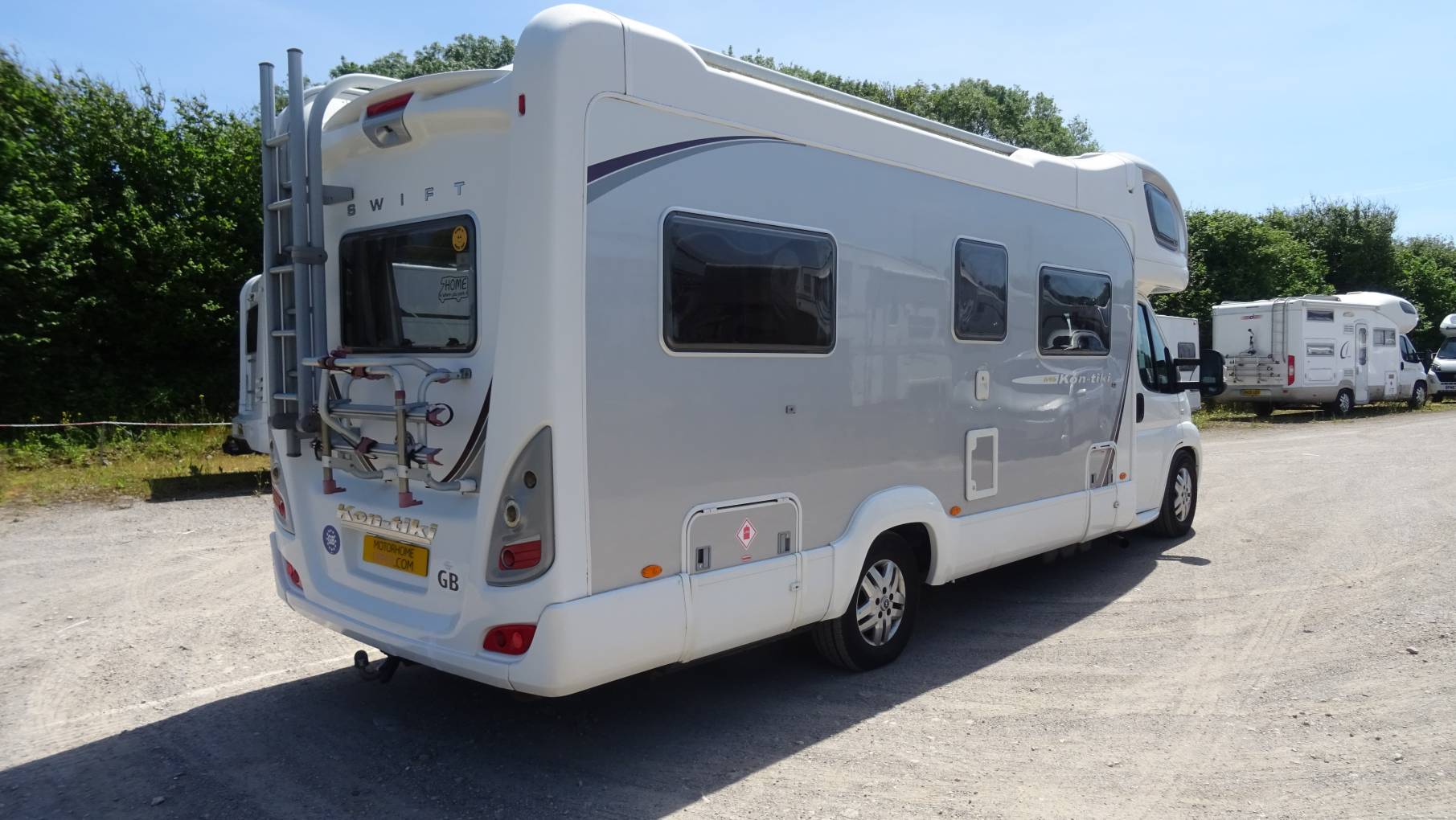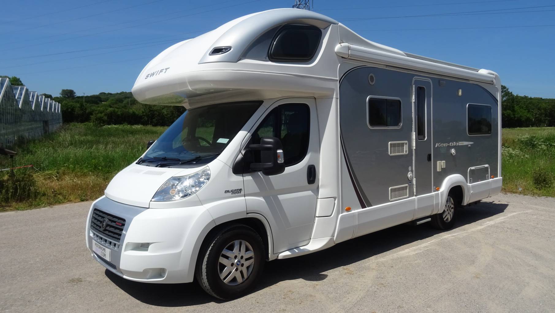For sale - A beautifully cared for Swift Kon-tiki 645 3L Fiat Ducato 160 BHP family motorhome, which comfortably sleeps five but with an adaption can cater for six. There are four three point seat belts, an over cab bed, a single/double bed behind the cabin and a rear lounge that also converts into a very large double or two singles. It has low mileage of only 40,547 and an excellent service history, and was serviced and MOT'd on the 22nd June 2021, and will have an habitation check to follow. The kitchen is well equiped with a three ring gas hob and hot plate, an oven with seperate grill, a fridge with freezer box, a single bowl sink with drainers, and an extractor and microwave. The washroom has a seperate shower cubicle and single wash basin with a swivel Thetford toilet all finished in white. This motorhome also comes with lots of extras such as a privacy awning, Kampa inflatable porch awning, TV/DVD Player, Cobra motorized Satellite system, hook-up cable, tow bar and a bike rack with an anti-theft alarm for those expesive bikes. The drivers cabin has cab air conditioning, reversing camera, Blaupunkt Radio/DVD/CD player, central locking, swivel front seats, concertina window blinds to cab and electric windows and mirrors. Approximate dimensions are length 7660mm, width 2350mm, height 3050mm and has a Revenue weight of 4250kg.