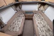 Onto the large rear lounge with two long inward facing settees split by a central chest of drawers. The included TV/DVD is mounted on a wall bracket on the wardrobe side.