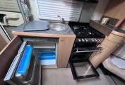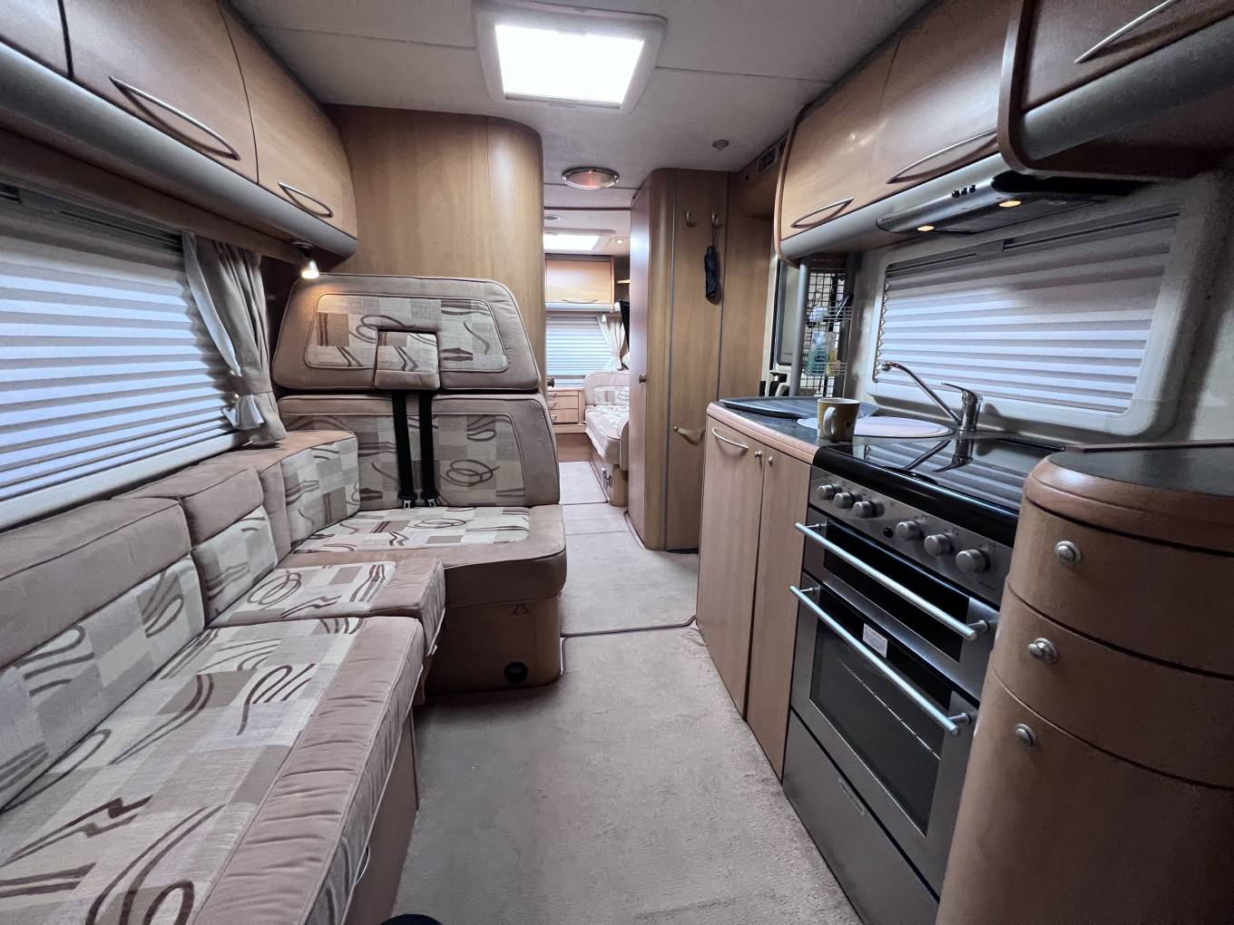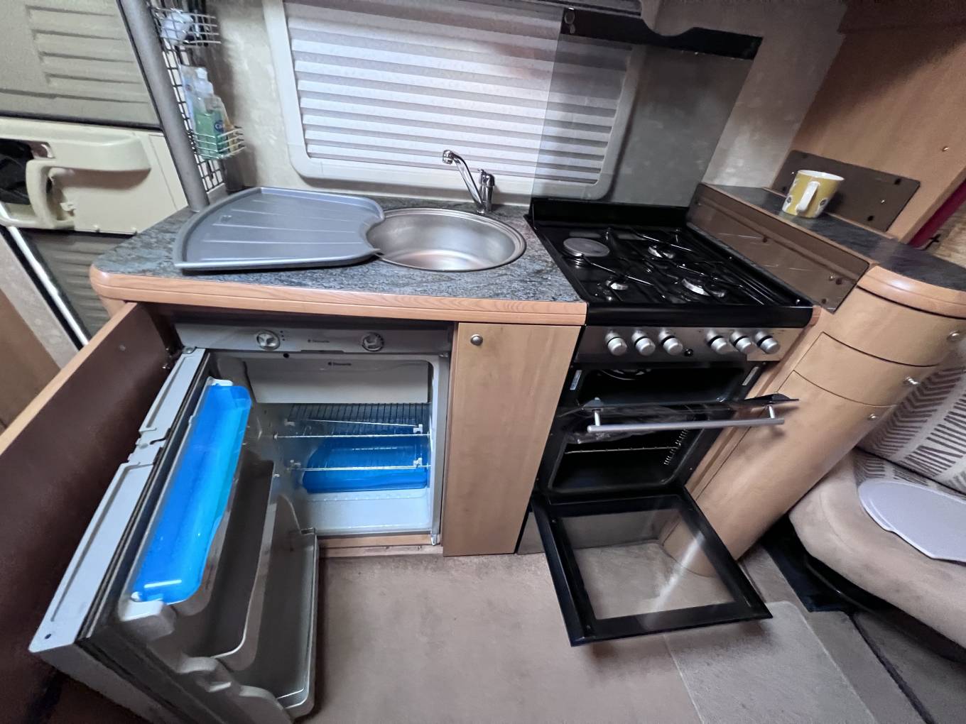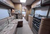 On entering via the habitation door (with electric step and flyscreen), to your left is the full equipped kitchen. Here you will find a Three Gas and One Electric Hob, a separate Grill and Oven, an overhead Extractor Fan, a Three energy source Dometic Fridge, Hot and Cold Water to the sink with a removable drainer and more than enough cupboard space.