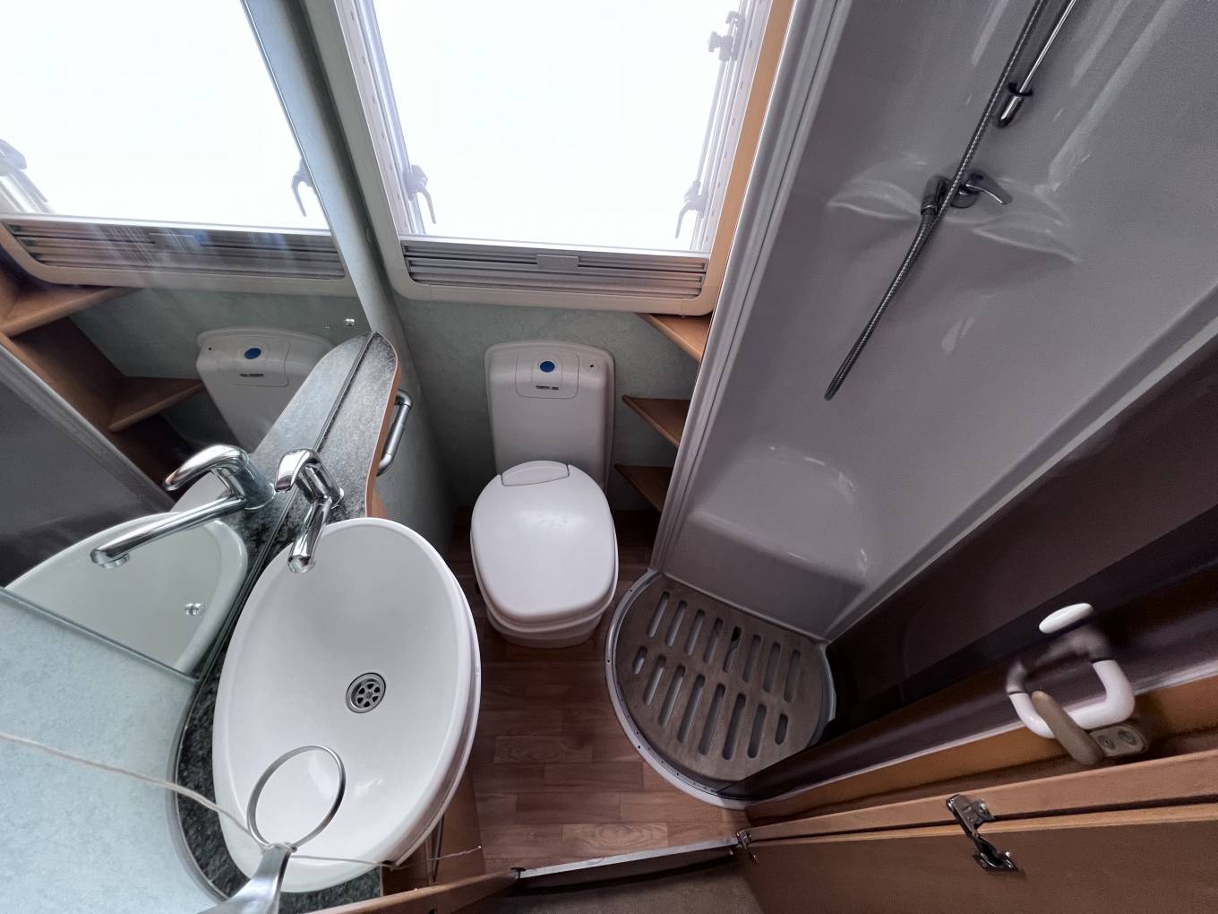 Opposite here is the bathroom containing a a Thetford flushing cassette toilet, a Wash Handbasin and a Separate Shower Cubicle, plus cupboard space.