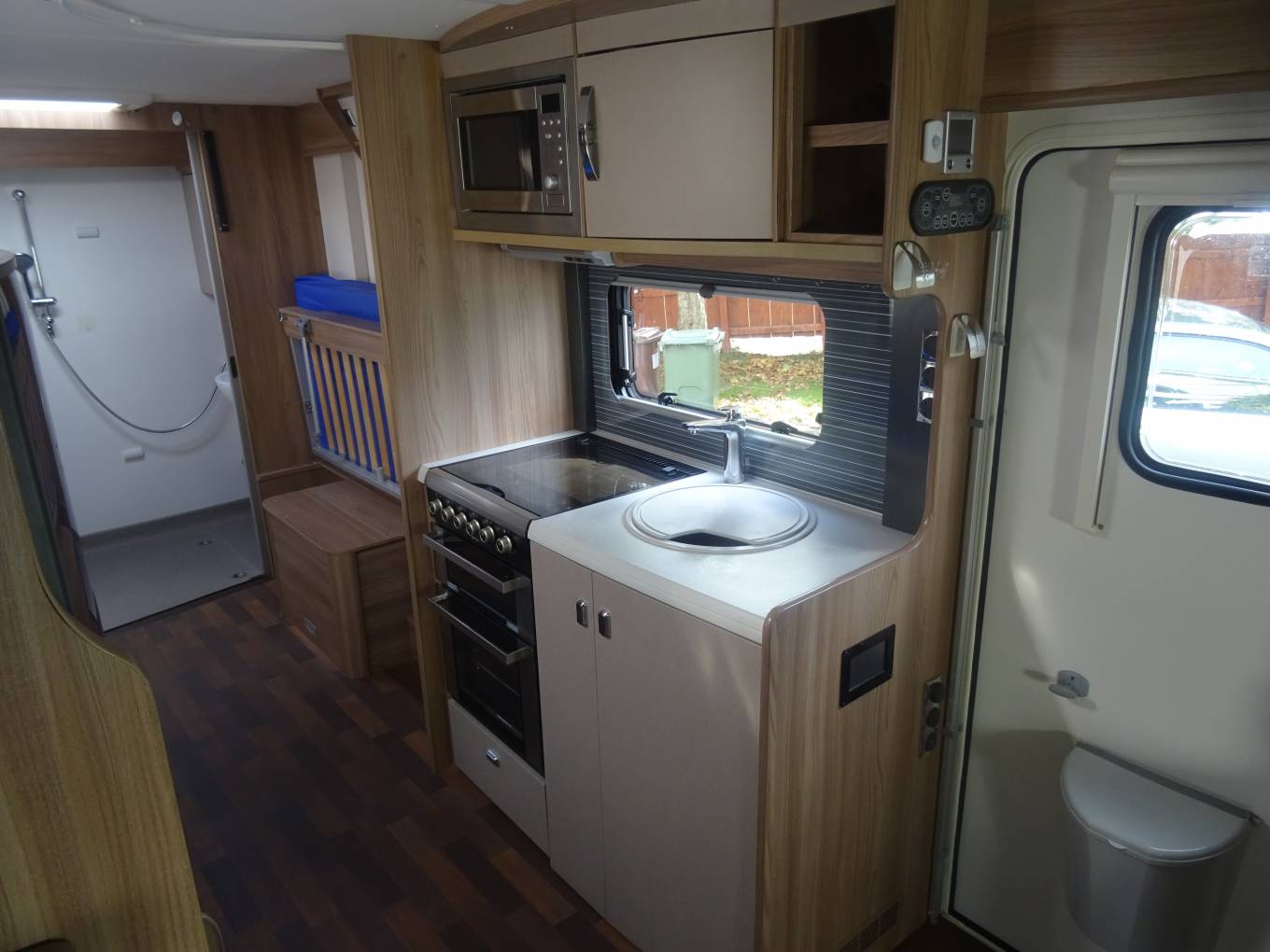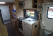 large Dometic fridge which has a separate freezer compartment, a hob with 3 gas rings and an electric plate, an oven with seprate grill, an extractor, a microwave oven,