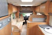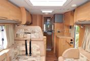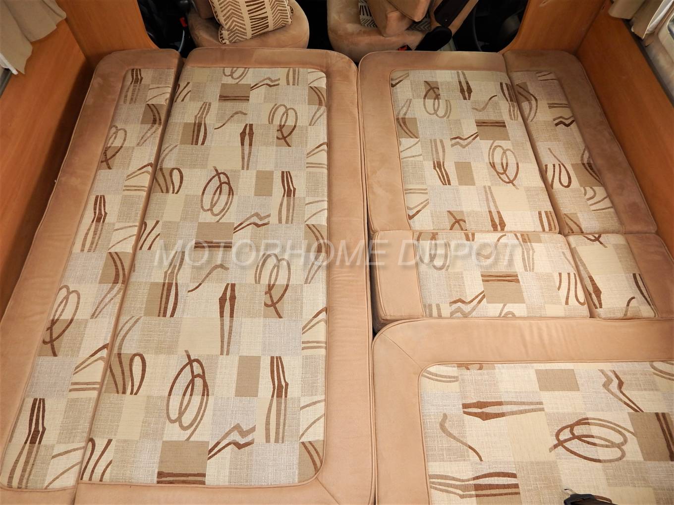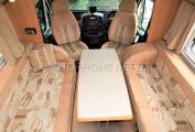 The lounge is made up of a long sofa on the passenger side and an L shaped sofa on the drivers side. Travelling seats can be made up by taking a piece of sofa away so that the legs can drop down to the floor. There is a removable table that stows in the rear wardrobe and the front seats rotate to join this area. You could easily seat 7/8 people around if entertaining on site. At night this area can be made up into a small double and a single, or the whole area can be made up into one large bed. This is achieved by pulling the bases together and using a combination of seat cushions as the mattress.