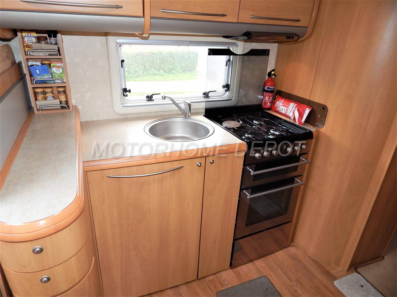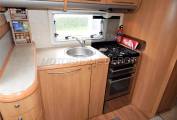 Opposite is the L shaped Kitchen area which consists of round stainless steel sink with chrome mixer tap; full sized oven & grill with multi fuel hob with one hot plate for use on site and 3 gas burners. There are plenty of storage cupboards for all your holiday provisions and a Microwave oven also for use on site. There is also a 12v kitchen extractor.