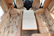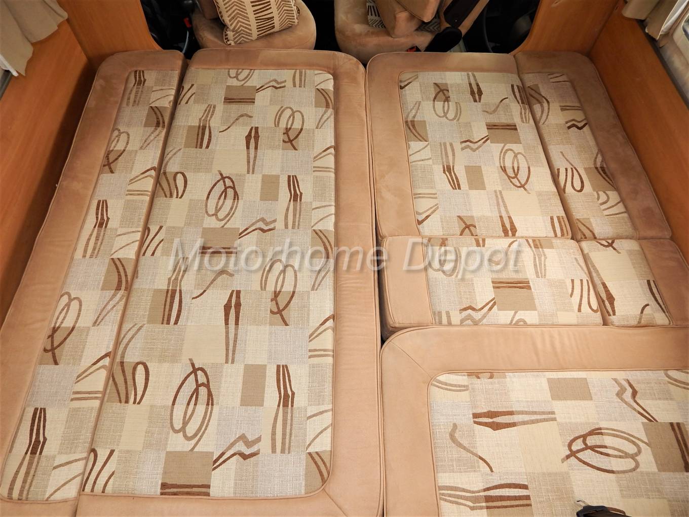 The lounge is made up of a long sofa on the passenger side and an L shaped sofa on the drivers side. Travelling seats can be made up by taking a piece of sofa away so that the legs can drop down to the floor. There is a removable table that stows in the rear wardrobe and the front seats rotate to join this area. You could easily seat 7/8 people around if entertaining on site. At night this area can be made up into a small double and a single, or the whole area can be made up into one large bed. This is achieved by pulling the bases together and using a combination of seat cushions as the mattress.