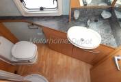 Finally to the rear is the bathroom which covers across the width of the vehicle giving light and space. There is a hanging wardrobe with integral shelves that also stores the dining table and the power supply unit / charger. The toilet is a cassette style Thetford fresh water flush unit with a swivel head. The white sink is built into a vanity unit with a chrome mixer tap. The shower has a separate cubicle with Perspex doors to close to keep the rest of the bathroom dry.