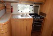 Opposite is the L shaped Kitchen area which consists of round stainless steel sink with chrome mixer tap; full sized oven & grill with multi fuel hob with one hot plate for use on site and 3 gas burners. There are plenty of storage cupboards for all your holiday provisions and a Microwave oven also for use on site. There is also a 12v kitchen extractor.