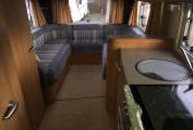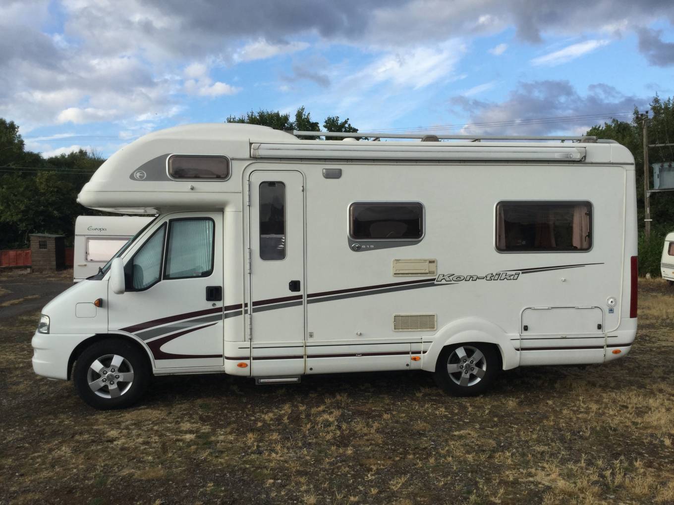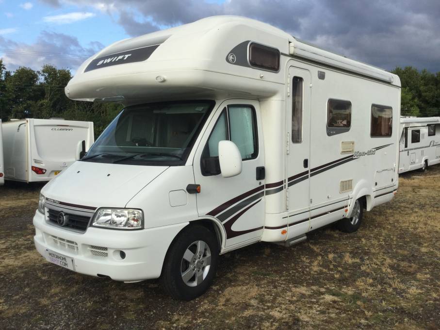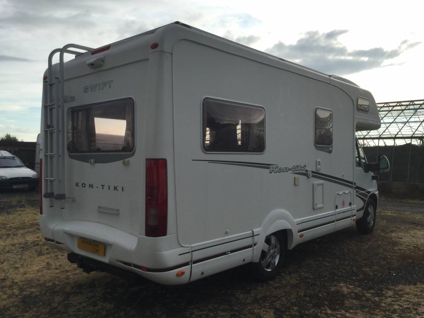 Swift Kon-Tiki 615 2.8 TDi manual with generous rear lounge and sleeping for 4. The tastefully appointed interior furnished in blue and cream fabric feels spacious and has the benefit of a generous rear lounge area which will comfortably dine 5 or 6 guests and easily converts to sleep 2 as a large bed or as 2 adult sized singles with further sleeping for 2 in the overcab bed. The washroom has a separate shower and the kitchen is well equipped with 3 way fridge, microwave oven, oven and grill, gas hob and sink. Lovely vehicle throughout, any trial or inspection is welcome. Long MOT to October 2019. Sold with new Habitation certificate, full service and 6 months warranty. Please call Simon on 01432 488 996 for further details. Part exchange and finance a pleasure. Vehicle owned and sold by SJ Leisure Ltd with 6 month warranty included in price.