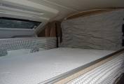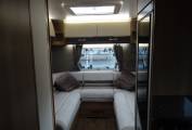 Going inside, to the front of the vehicle the lounge/dinette has ample seating for 6 and a removeable table. All 4 of the facing seats have seat belts allowing 6 passengers to travel safely - a TV Ariel point is also fitted. The seating area makes into a convenient double with a drop down bed above that also has a Duvalay mattress, allowing a total of 4 people to sleep in this area. All windows, have fly screens and night blinds are fitted including the front cab.