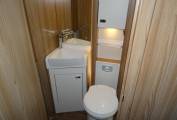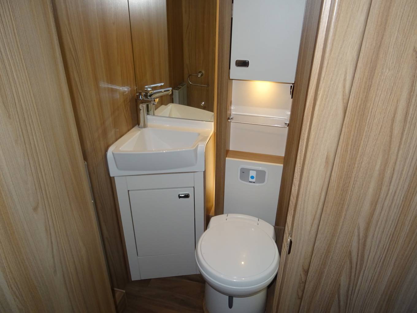 Opposite the kitchen area is also a large bathroom area, consisting of a separate shower, cassette toilet, radiator and vanity unit with plenty of lighting and storage. Next to the bathroom is a large wardrobe with storage space below.