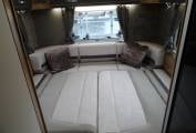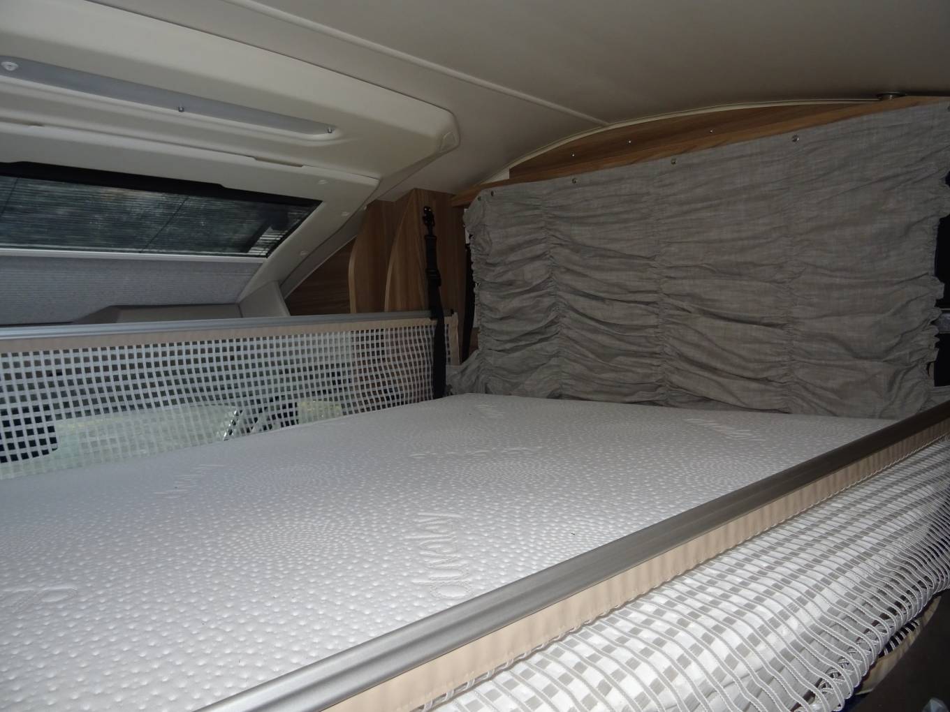 Moving to the centre, the kitchen includes all the facilities you would expect from this size of vehicle - an oven, grill and 4 burner hob (1 electric), a large fridge with freezer compartment which has the facility for the door to open both ways! The kitchen also has a microwave, under cupboard LED lighting and an extendable worksurface. The Motorhome has a winter pack fitted as standard, the carpets are unused making winter breaks a must as there is also the dual fuel Alde central heating system that can be controlled from an app on your phone.