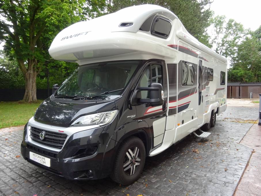MotorhomeDepot.com Chester and Wirral present for sale this January 2018 (67 reg) Swift Kon-tiki 649 Black Edition with the 180bph 2.3l engine and 6 speed manual gearbox. This one owner from new motorhome has covered just 8958 miles. Layout starts with an overcab double bed, a forward lounge with six seatbelts, kitchen and washroom in the middle then a rear lounge. In the kitchen is a full cooker offering gas and electric hobs, extractor fan, a grill and oven. There is a Dometic fridge with a freezer box, stainless steel sink and microwave oven. Opposite is the bright, light and airy washroom with lavatory, sink and screened shower. Heating and hot water is efficiently provided by the Alde 3020 boiler. Habitation Air Conditioning has been fitted ready for this season at a cost of £1900 but not used yet.