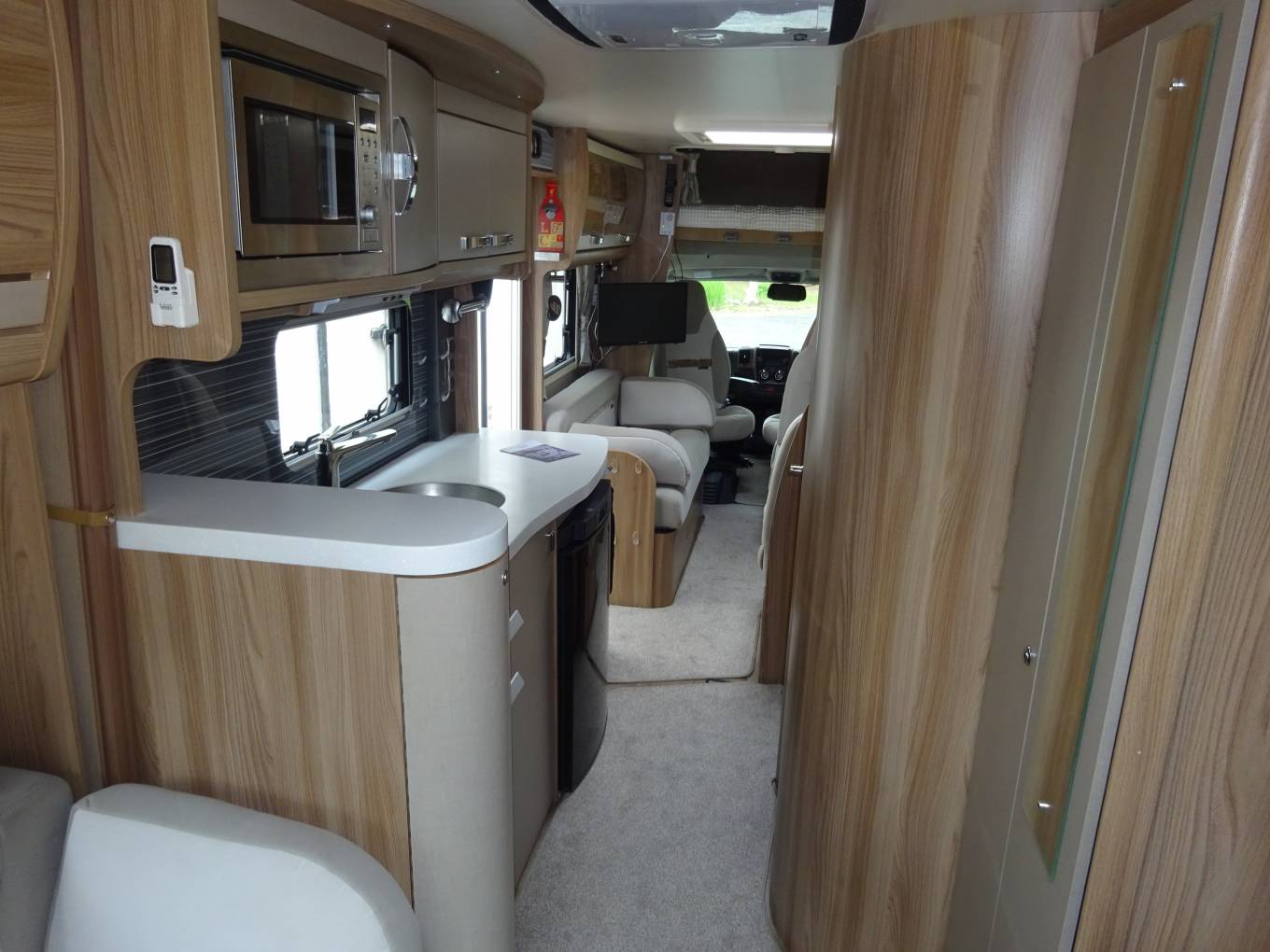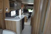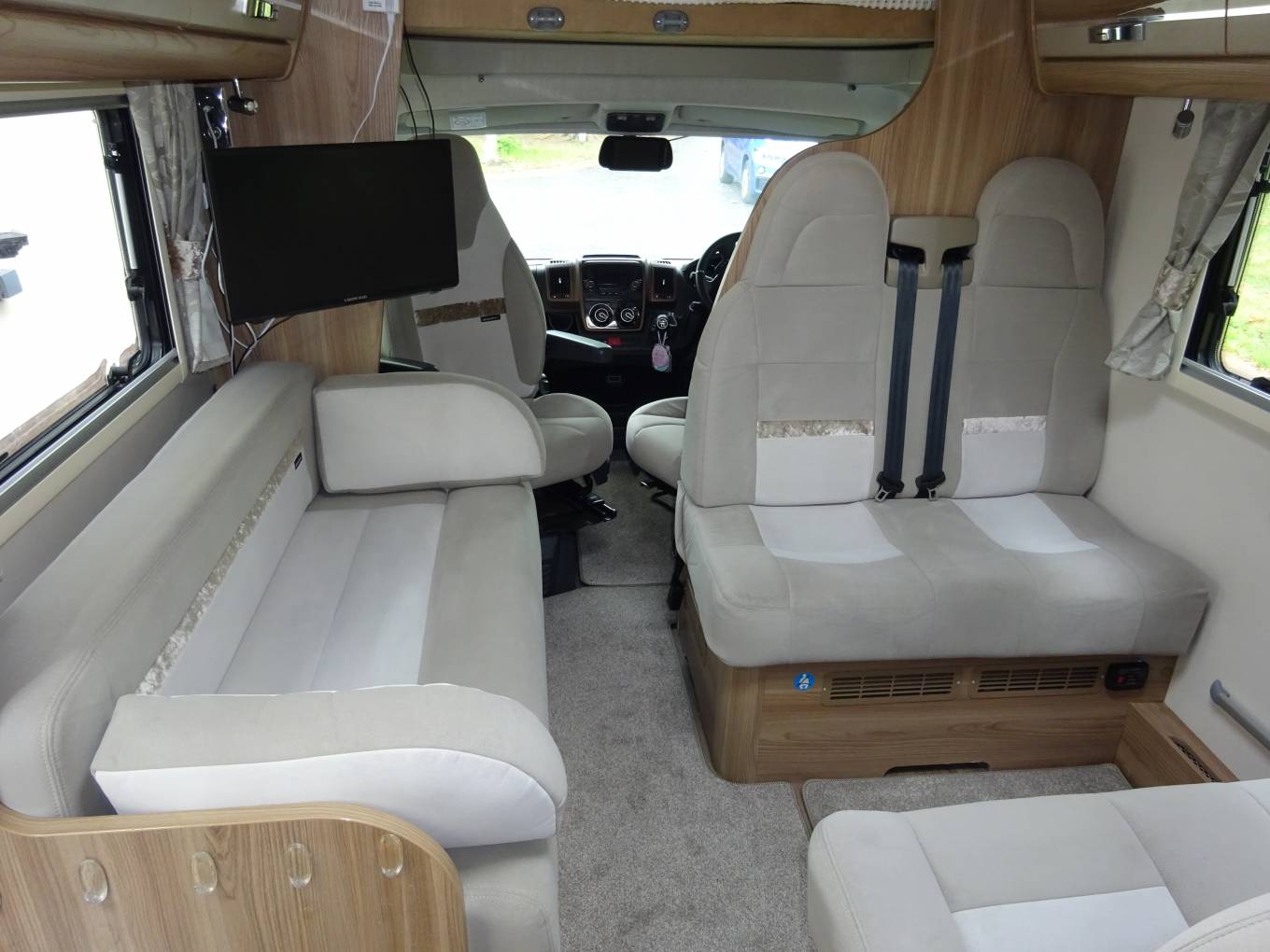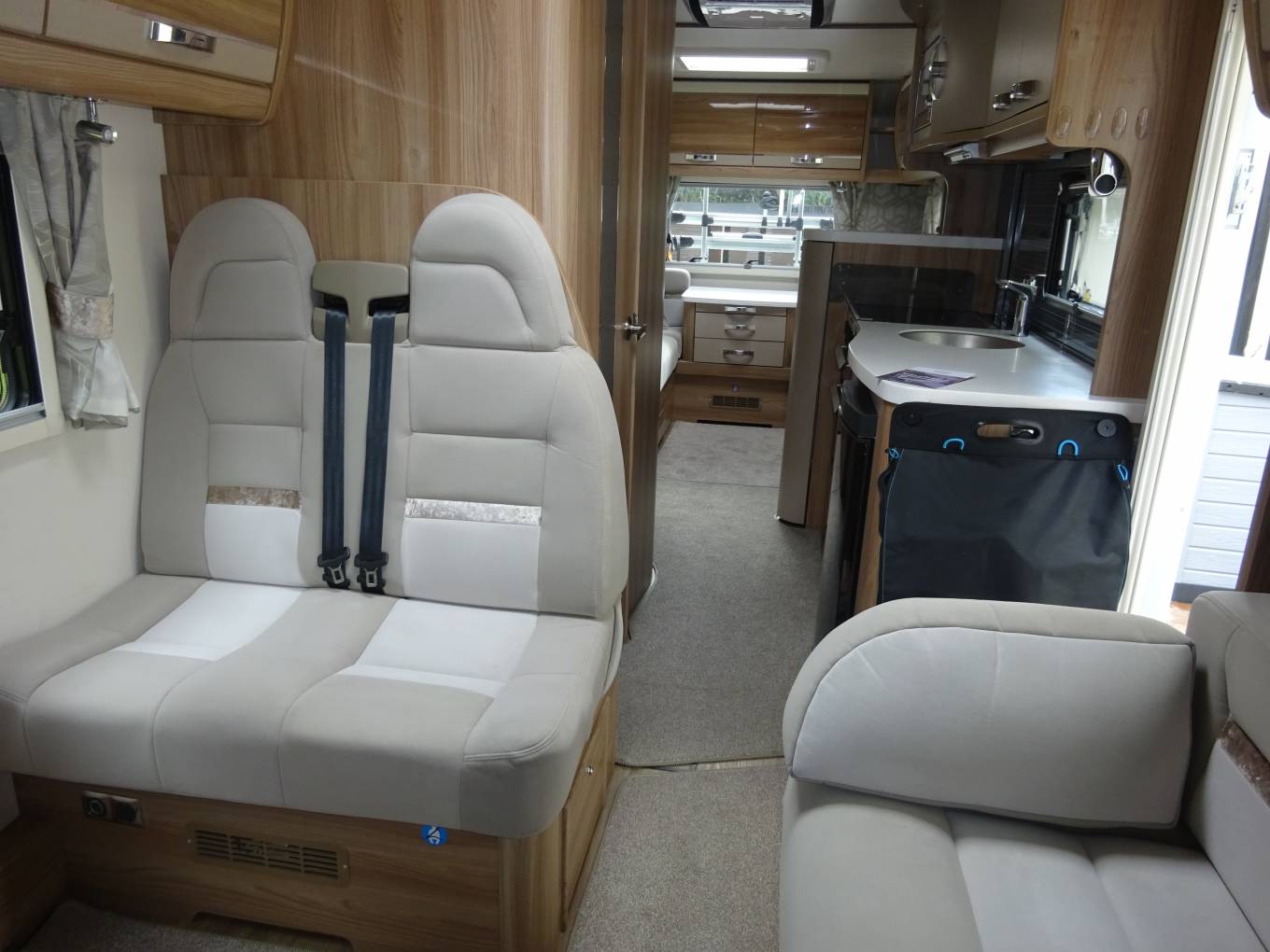 Based on the Fiat Ducato with 2287cc 180 bhp diesel engine and 6 speed manual gearbox. In the cab we have Air Con, cruise control. Reversing camera. Pleated black-out system for front and side windows in driver’s cabin, electric mirrors and front windows. There are 3 sets of keys. Outside we have a Fiamma F45L wind out awning, a Gaslow two bottle LPG system is fitted with an external filler, easy to fill and very cheap to run. There is a bike rack for 4 bikes, external shower and BBQ points. Given the value of the motorhome and all the extras fitted a top of the range alarm system ahs been fitted in addition to the the swift command tracking system.
