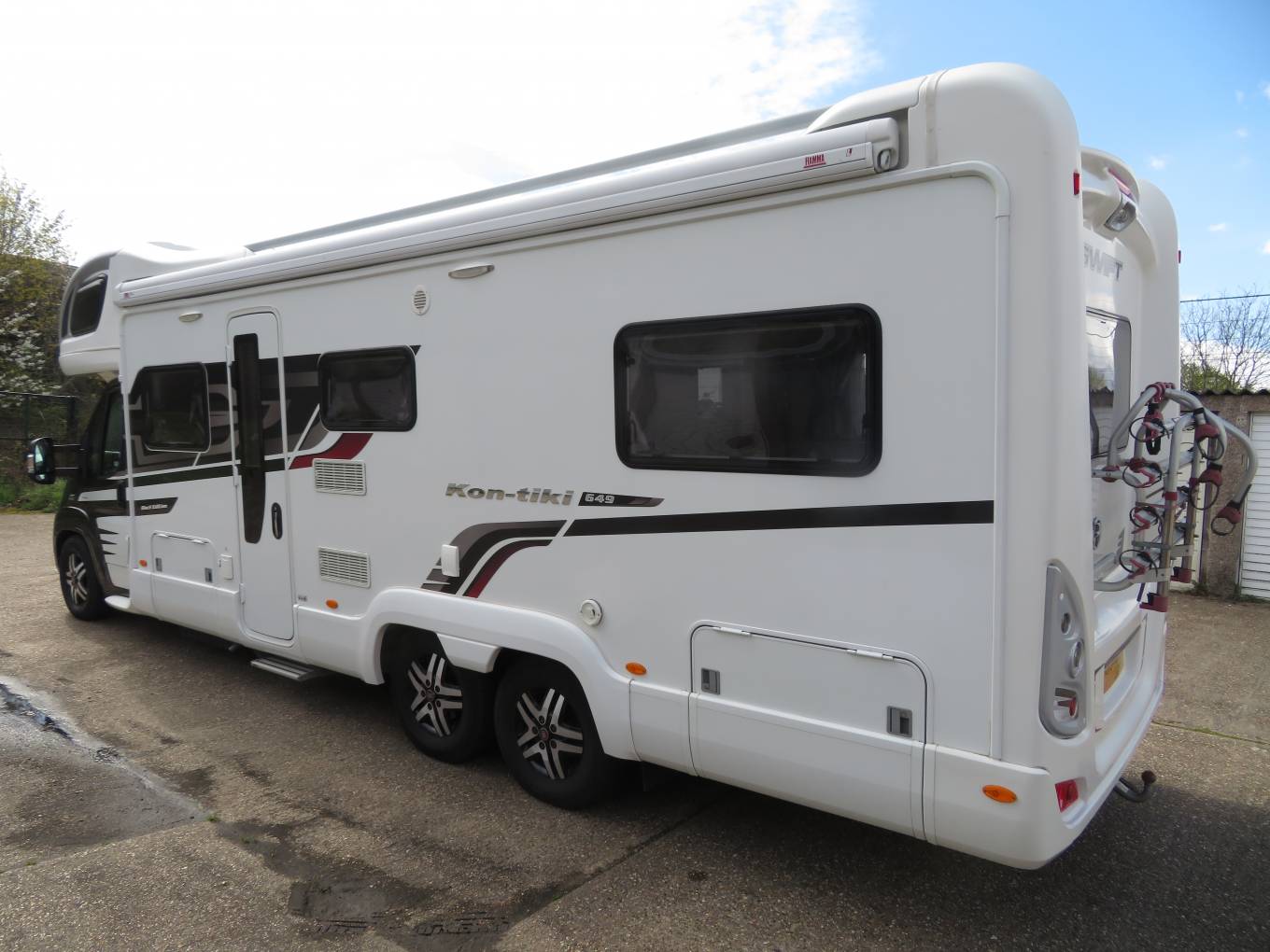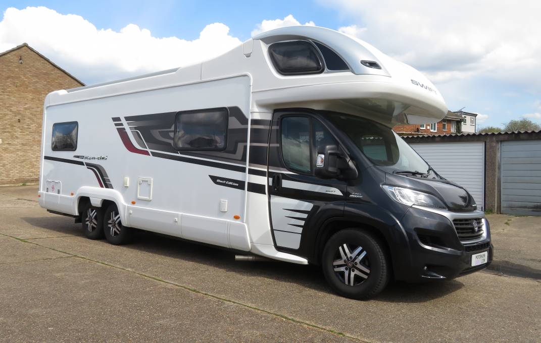 This Stunning Black Edition version of Swifts ever popular Kon-Tiki 649 model, is a fantastic family motorhome having 6 berths and 6 travelling seats. This particular model is presented in fantastic condition and is a credit to its current owner. The motorhome is based on a Fiat chassis with a 3 litre 180 BHP engine & a 6 speed manual gearbox. The cab benefits from air conditioning, electric front windows and a dual camera rear view screen in place of the rear mirror.
