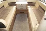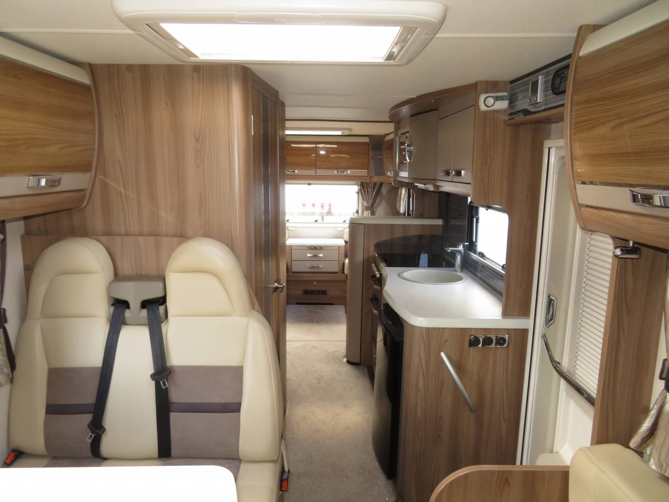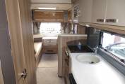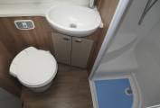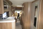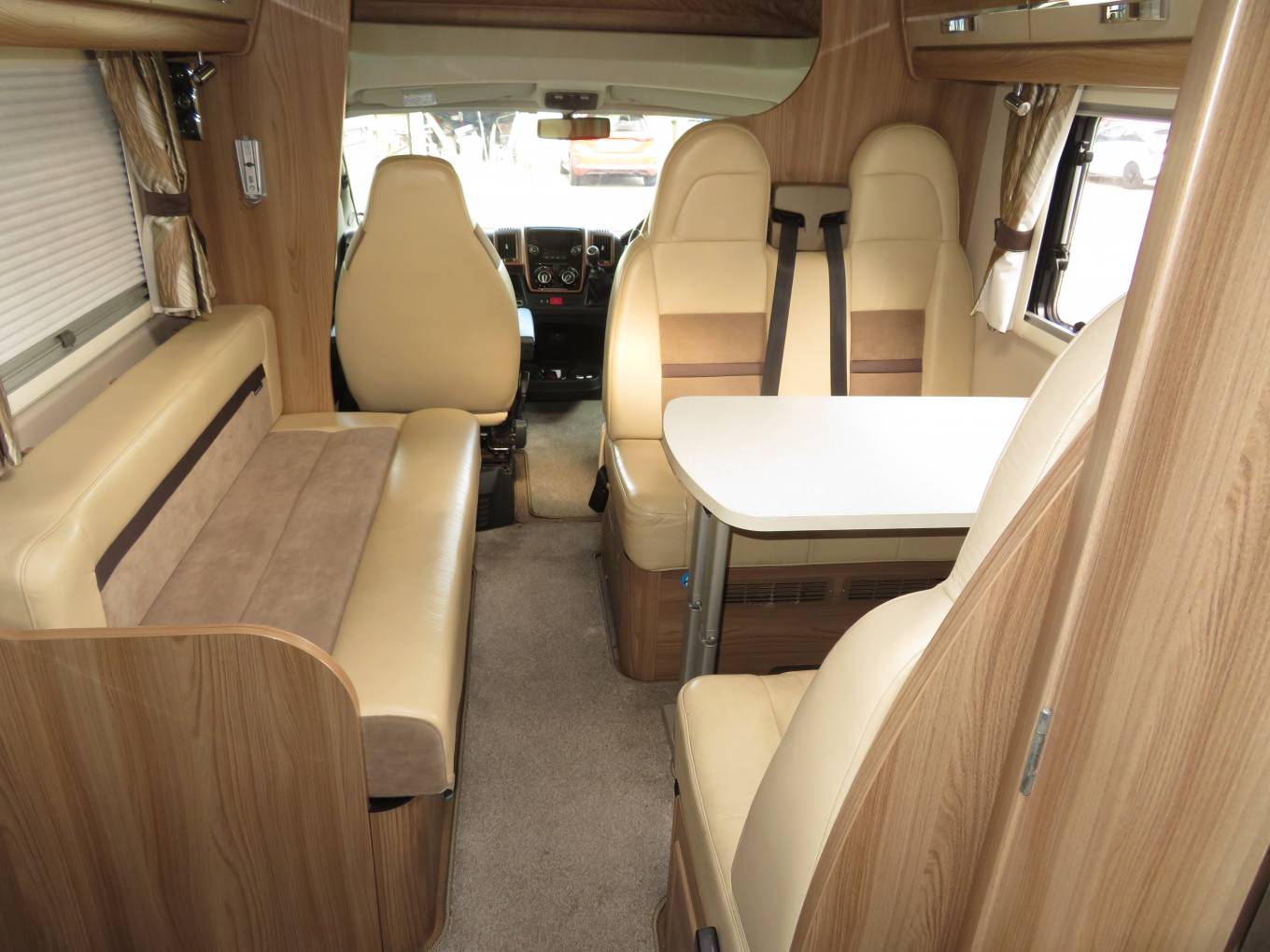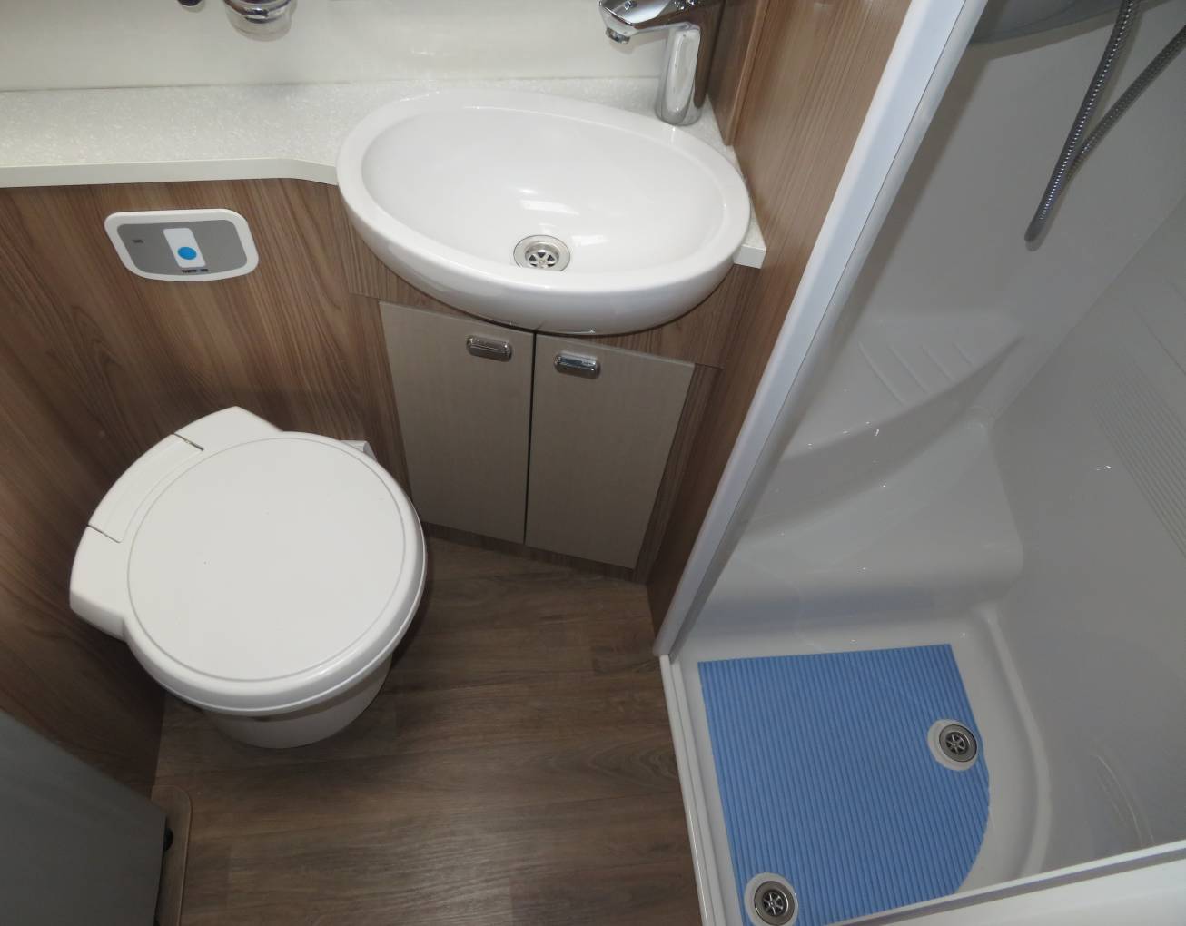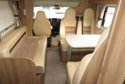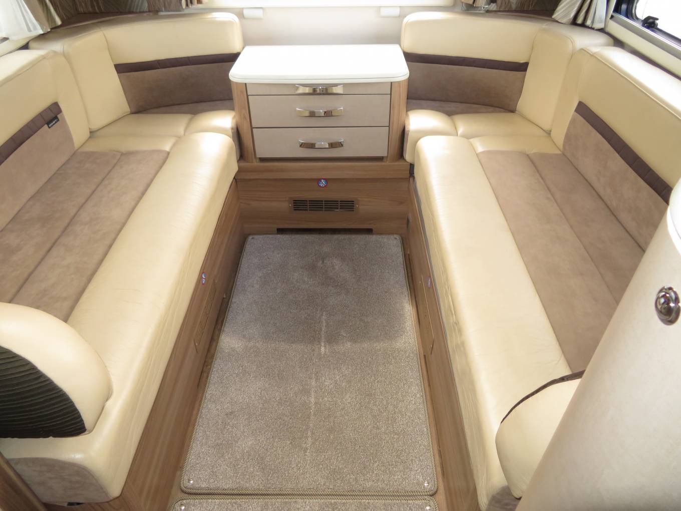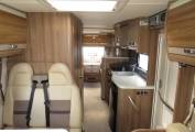 The 649 has a great living area set up, as you enter the motorhome via an electric step immediately to the left is the dinette which consists of 2 front and back facing double seats with 4 x 3 point seat belts and a fixed table. On the opposing side is a double sofa. This area makes up into a large double bed by dropping the table down and using a combination of sofa cushions and infills. To the right is the Kitchen area which comprises of a large work surface with a round white enamel style sink and chrome mixer tap. The fridge freezer is under the counter and is a Dometic 3 way absorber unit that can be powered by; 240v,12v or gas depending whether you are plugged in on site or wild camping. There is a full oven and grill with a dual fuel hob comprising of a 240v hot plate and 3 gas burners. Overhead there is plenty of locker space and a microwave. Opposite the kitchen is a large bathroom which has a Thetford fresh water flush toilet, built in wash hand basin with chrome mixer tap and vanity unit. The shower separates from this area completely with the use of perspex doors.