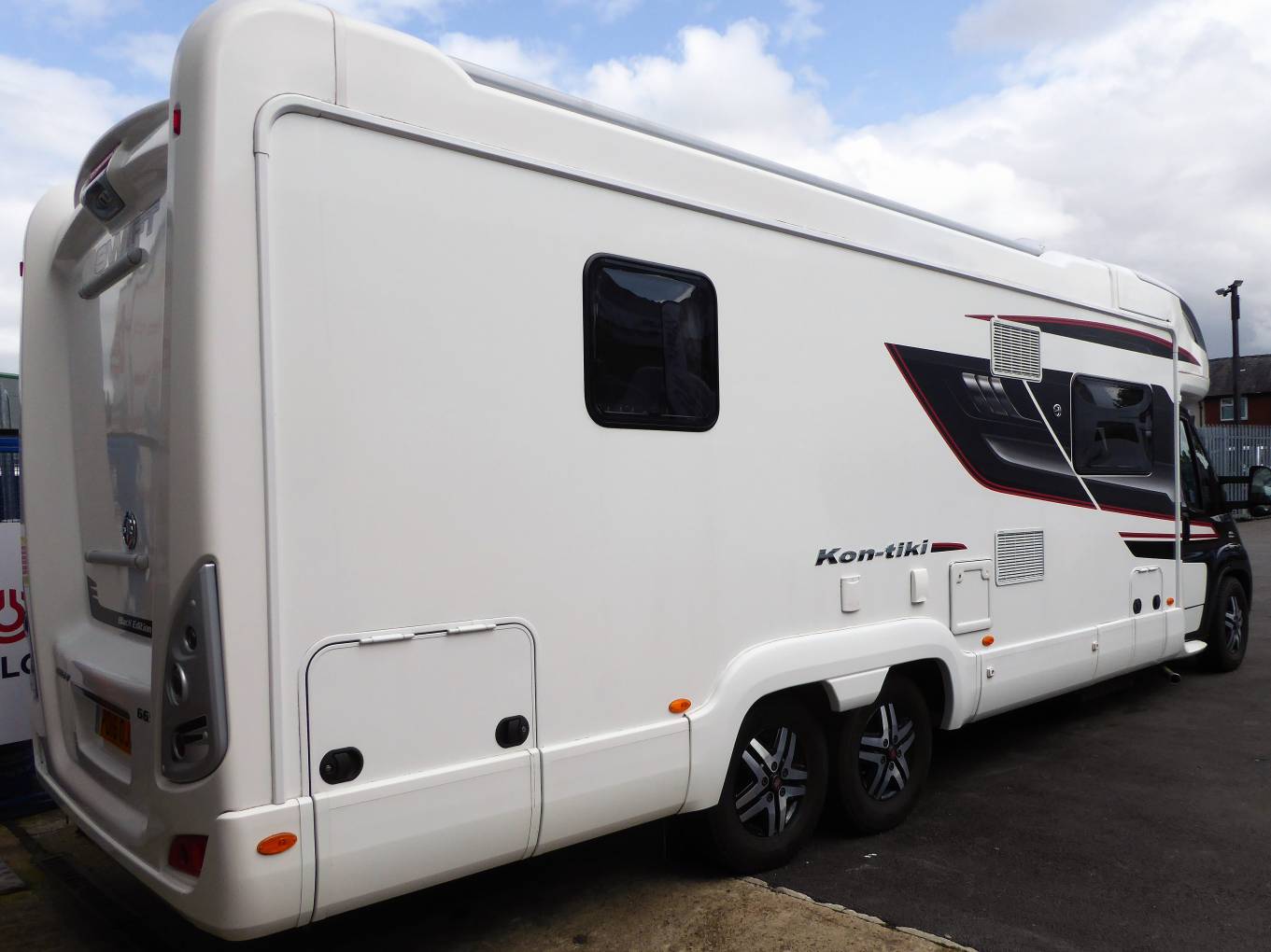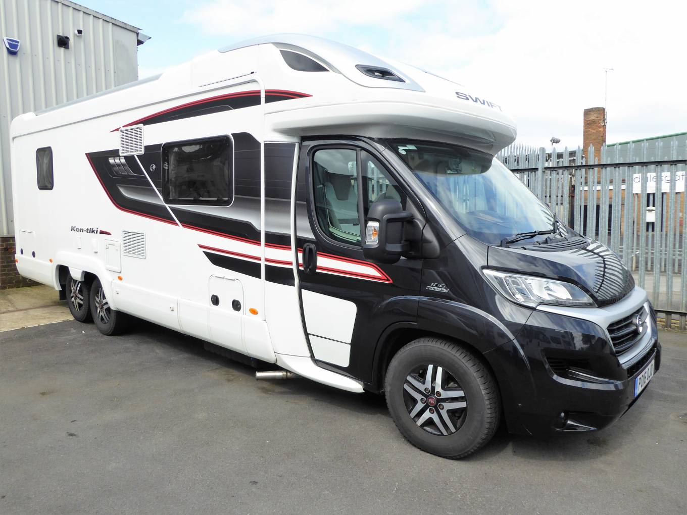 Call with any questions 01423 609985. This stunning Swift Kontiki 669 Black Edition, is one of few on the market and is in immaculate condition having travelled 6,966 miles only. This 4 berth, low profile coachbuilt motorhome sits on the Fiat Ducato chassis and powered by the 180bhp, 2999 cc engine with 6 speed manual gearbox. At the rear, there is a spacious island bed which lifts to allow for extra storage space. There is a modern feel to the galley style kitchen, including a cooker with 3 burner gas hob, additional electric ring, oven, grill and microwave above. These are complemented by sink, masses of clever storage and opposite the large 3 way fridge and separate freezer. Opposite is the washroom with handwash basin, cassette toilet and a separate shower enclosure. Into the dinette area, we have 2 additional forward facing seatbelts, and a comfortable side sofa This converts into a second sleeping area as well as providing good lounging space. Upfront, both seats swivel and there is panoramic sunroof. There is an extensive list of extras including, Alde central heating, External shower and gas BBQ point, fixings on the bodywork for a bike rack, solar panel and reversing camera. This stunning motorhome can be seen in Harrogate, North Yorkshire. Please note this vehicle is owned by a dealer, as a potential buyer, should you purchase this vehicle, if the vehicle is not as described, of satisfactory quality or fit for purpose you may have a claim under the Consumer Rights Act 2015.Part Exchanges welcomed on this vehicle, for further information and photos please call us on 01423 609985 quoting Reference 105980.