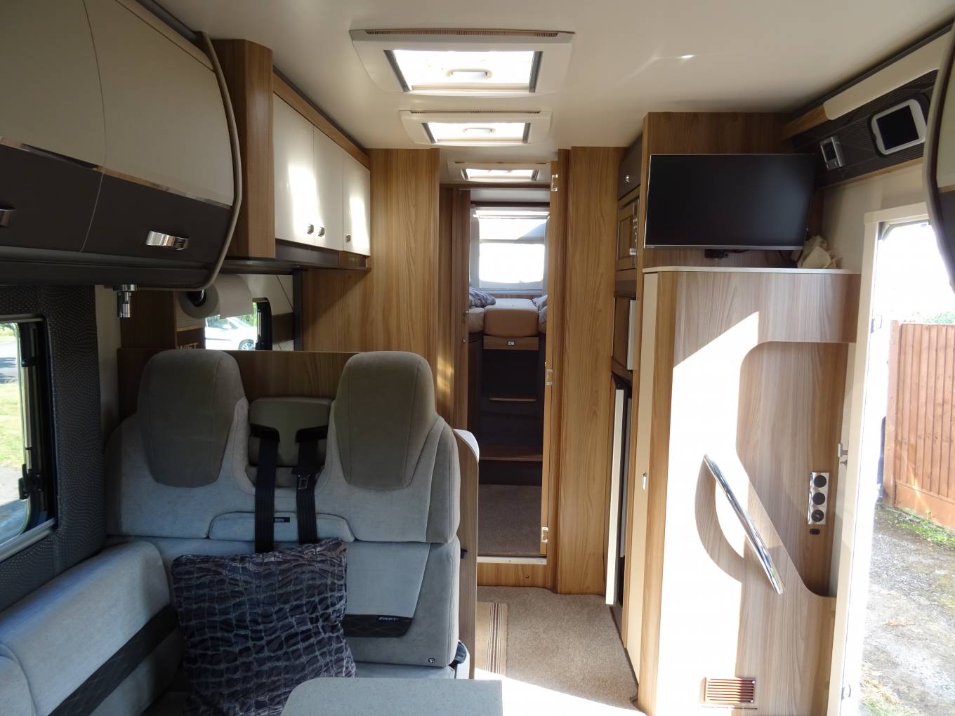 Externally, the vehicle has 6 alloy wheels, a reversing camera, awning, storage draws and a full size sport garage. The cab is fitted with air conditioning, cruise control, a media unit and twin swivel seats. The engine has the 180bhp power upgrade. It has an automatic gearbox. At just over 9 meters long this flag ship model is sure to provide you with the very best in accommodation and is all ready to drive away.