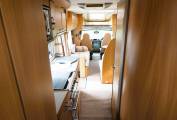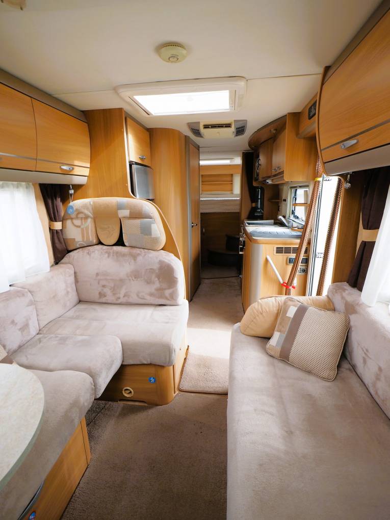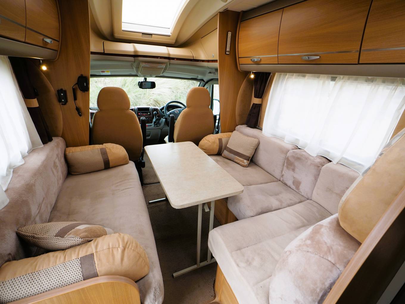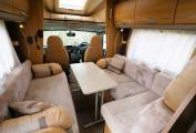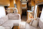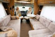 Up front is the comfortable lounge area with sofas to both sides and the addition of the front driver and passenger captains chairs swiveling into the living area to provide additional seating. As well as the aforementioned occasional table that provides space for dining or entertaining, there is an adjustable coffee table on a swinging arm. The cab is fitted with Reimo concertina blinds to shut out the outside world and provide privacy when parked up.