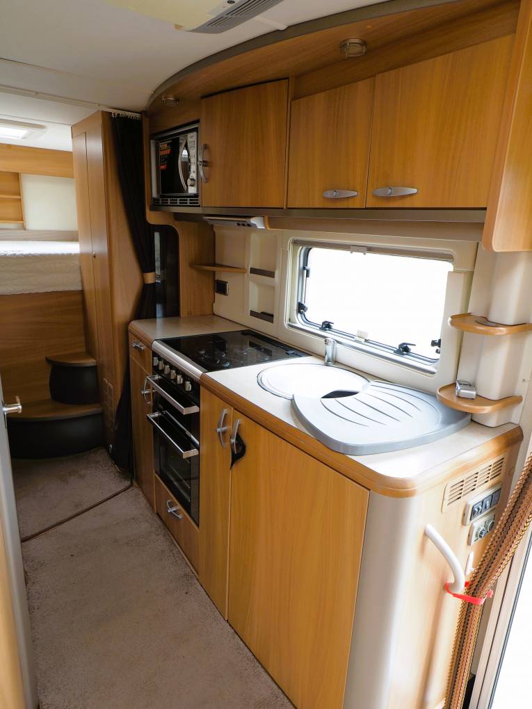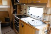 Above the garage is the large fixed double bed providing plenty of room for a couple to stretch out and relax with the spacious lounge converting to provide a further double bed sleeping space. Centrally there is the well equipped kitchen providing all even the most keen of cooks would need to rustle up anything from a simple snack to a full blown Sunday roast dinner. Comprising an oven and separate grill with duel fuel hob above, extractor fan and microwave oven, large fridge with freezer box and sink with running hot and cold water.