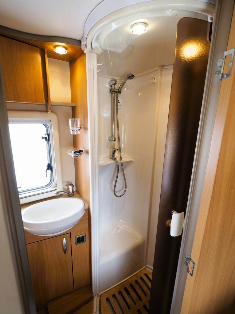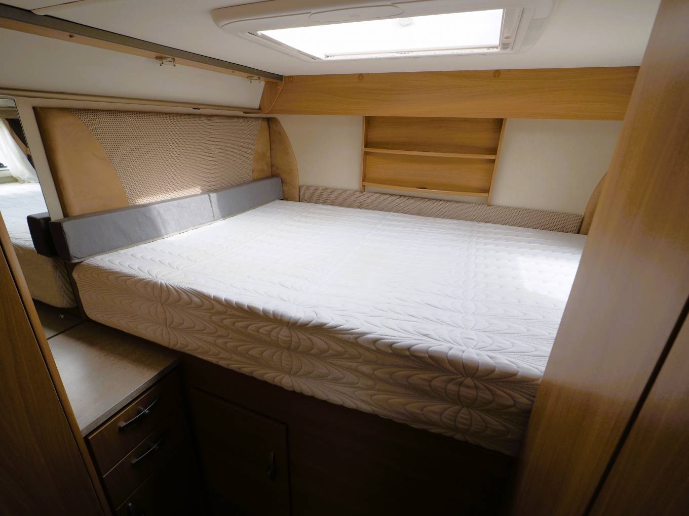 Opposite is the washroom, providing home from home comfort with flushing cassette toilet, sink and vanity unit and separate shower. To the side is a large wardrobe with hanging rail and storage for the occasional dining table. Racking storage under and a second wardrobe opposite along with additional cupboard and drawer space.