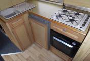 As you move backwards you come to the kitchen. Here you will find a 4 gas burner hob, a gas oven and grill, a 3 way fridge freezer, a sink with mixer tap and plenty of cupboard and drawer space to store all of your essentials. There is also a generous amount of work top space for food preparation. Next to the kitchen is the washroom which has a shower, a wash basin, a cassette toilet, a large mirror and a bathroom cabinet so you have everything you need to keep fresh. Opposite the washroom at the rear of the motorhome is another dining area with a forward facing and a rear facing seat and small table that can be unclipped and stored away when not in use.