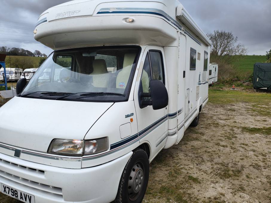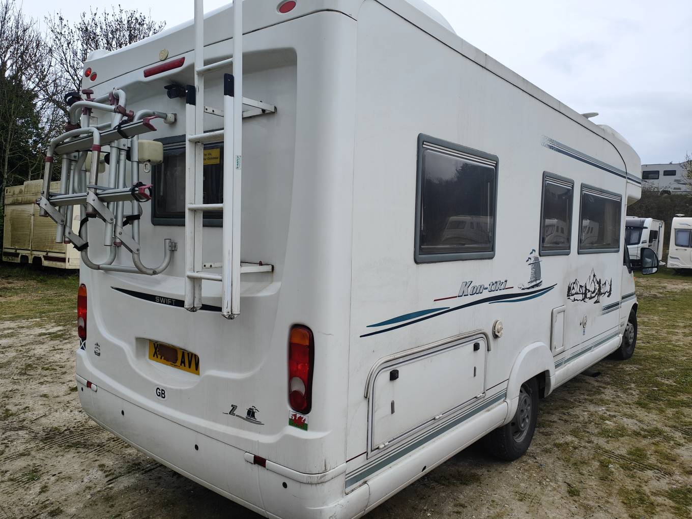 This is a lovely example of Swifts flagship Kontiki Z. This 24ft long motorhome has 3 berths and 3 seatbelts and weighs in at only 3500kgs so can be driven by all. Featuring a unique fixed bed to the rear, a well equipped centre kitchen and bathroom with separate shower and a large seating area to the front that utilises a rotating cab seat. Based on the excellent Fiat Ducato 2.8 turbo diesel with power steering. This example also includes an awning, bike rack, tv and aerial, solar panel, microwave and a reverse camera. Based in Kent and more pictures available. Awaiting preparation.