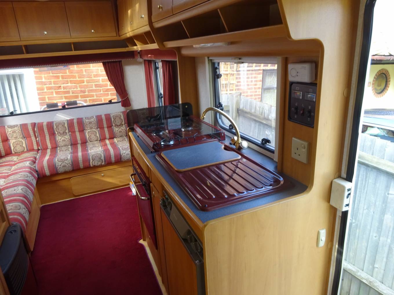 Centre of the motorhome with full cooker , gas hobs , sink , and fridge freezer