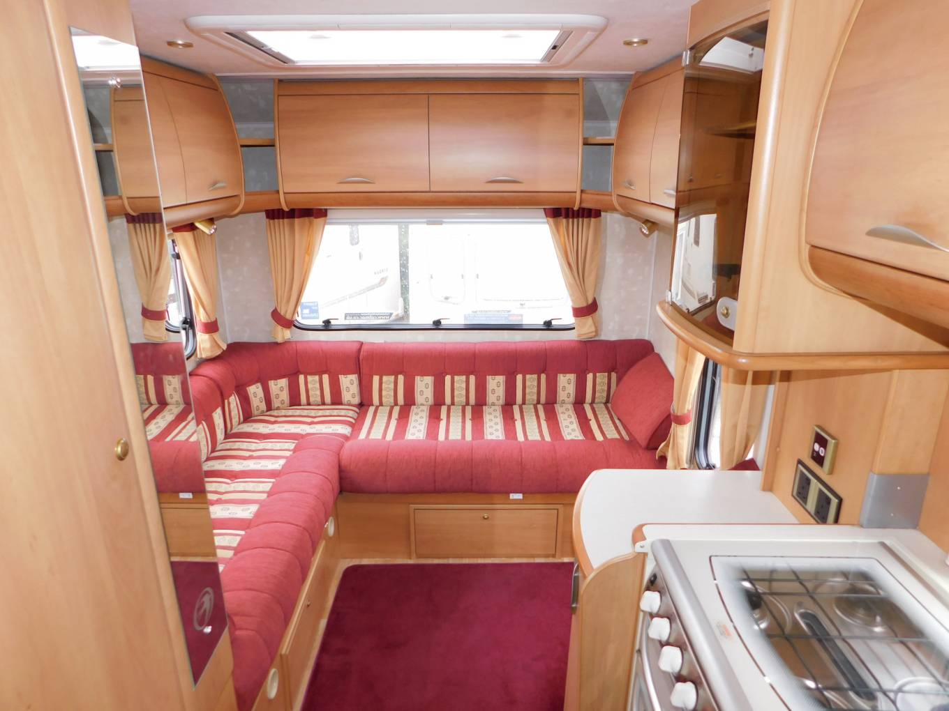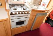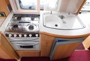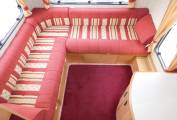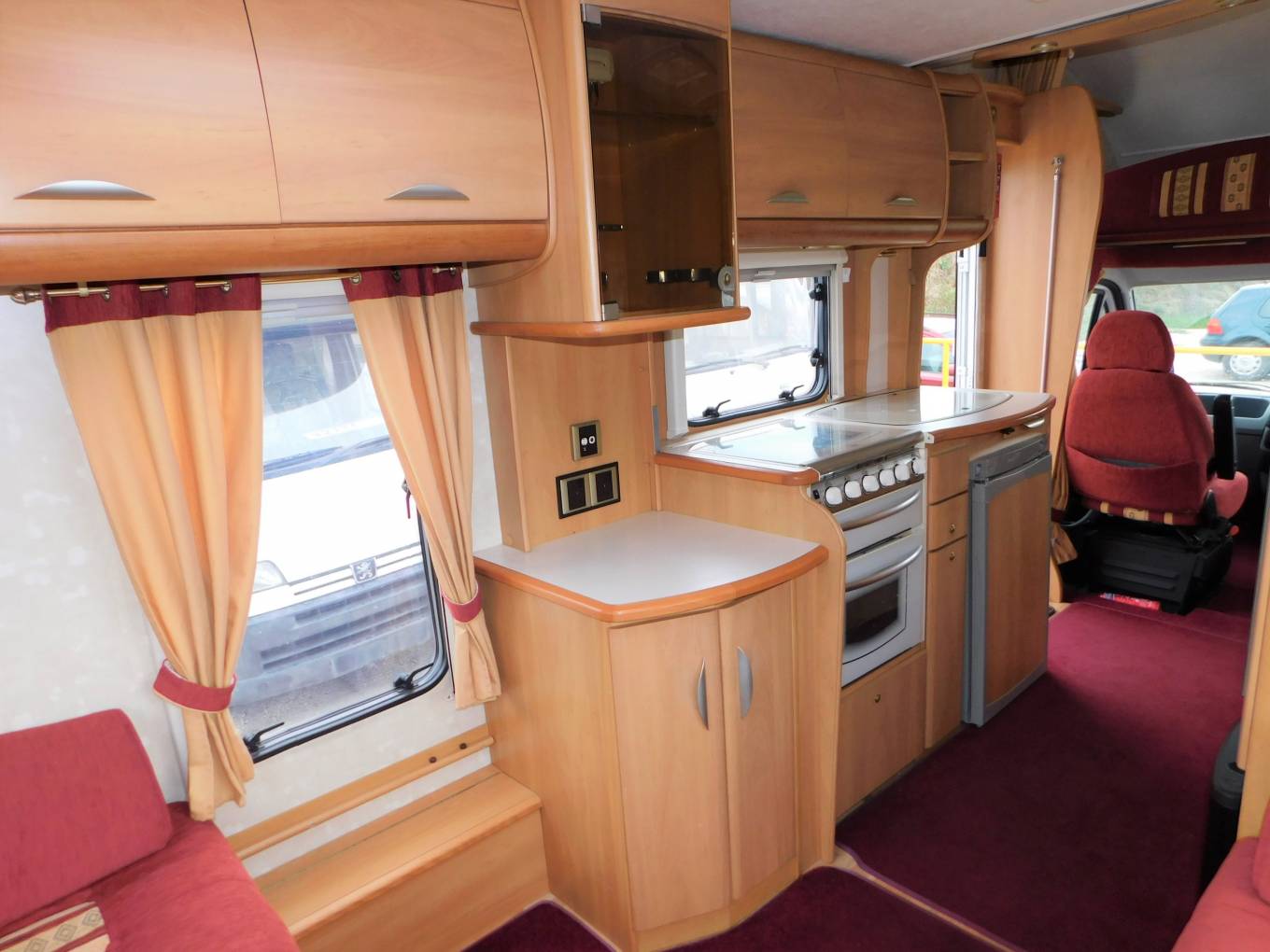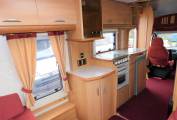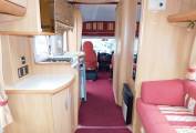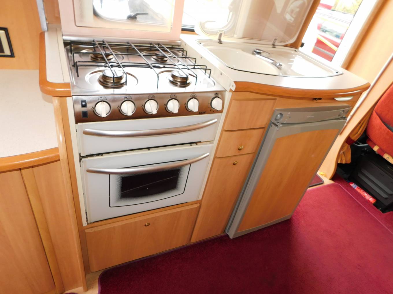 Using the electric step to enter, you have the kitchen to your right, with a very large sink with draining board, pop-up mixer tap and fold-up glass lid. A four gas burner hob with glass lid, a gas grill and oven beneath. There is an Electrolux three-way powered fridge with ice-box, plus plenty of upper and lower cabinets to store away your holiday provisions.