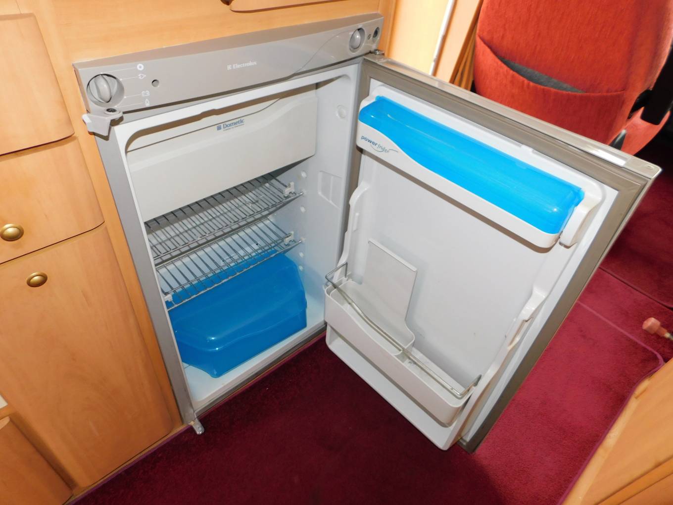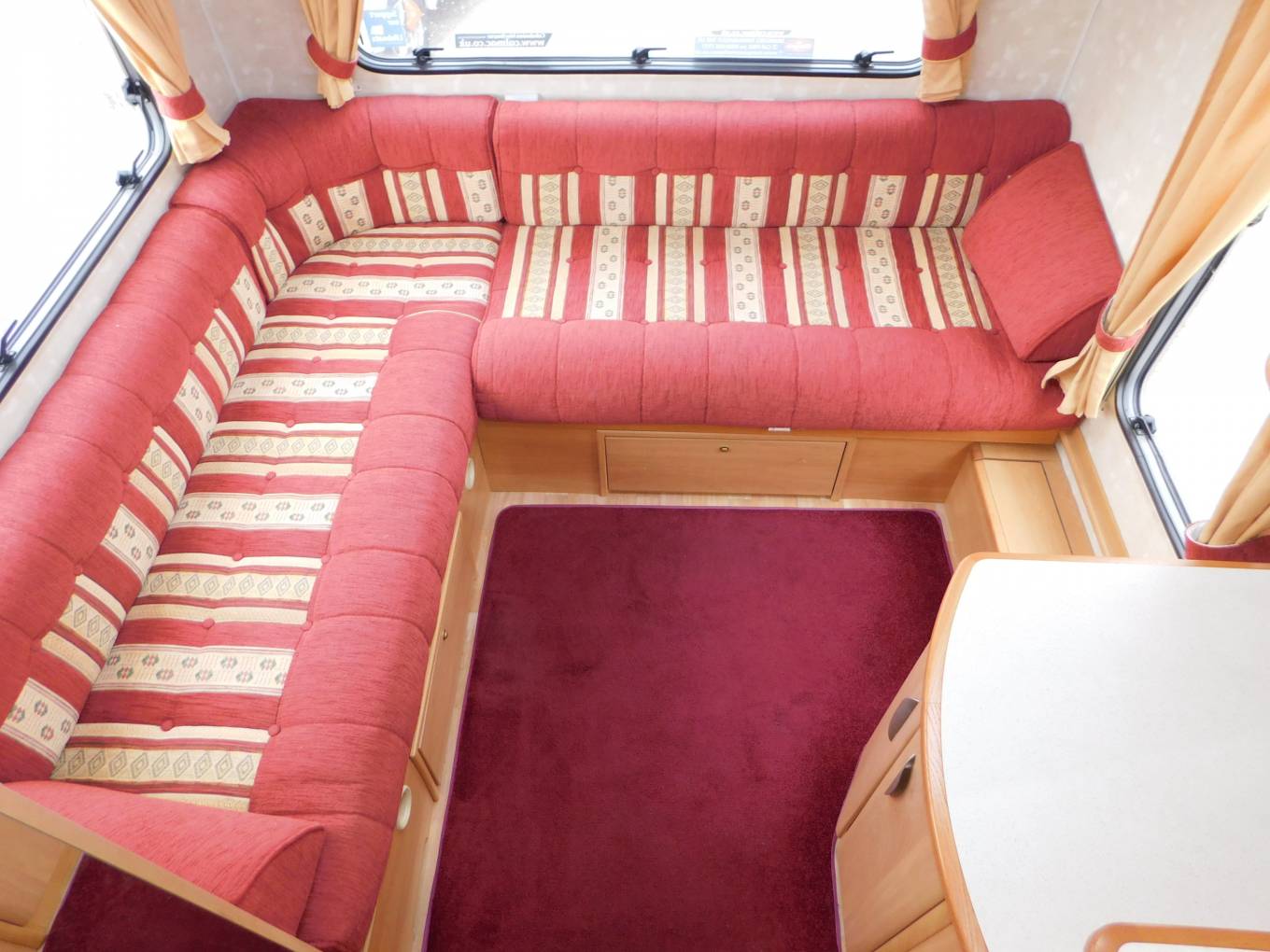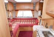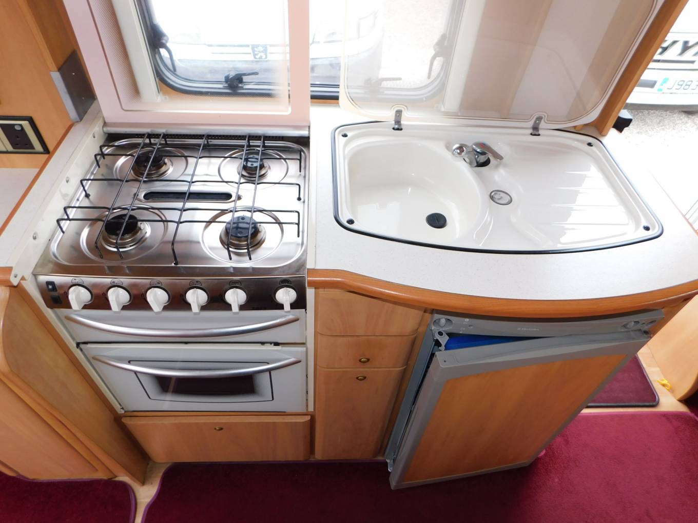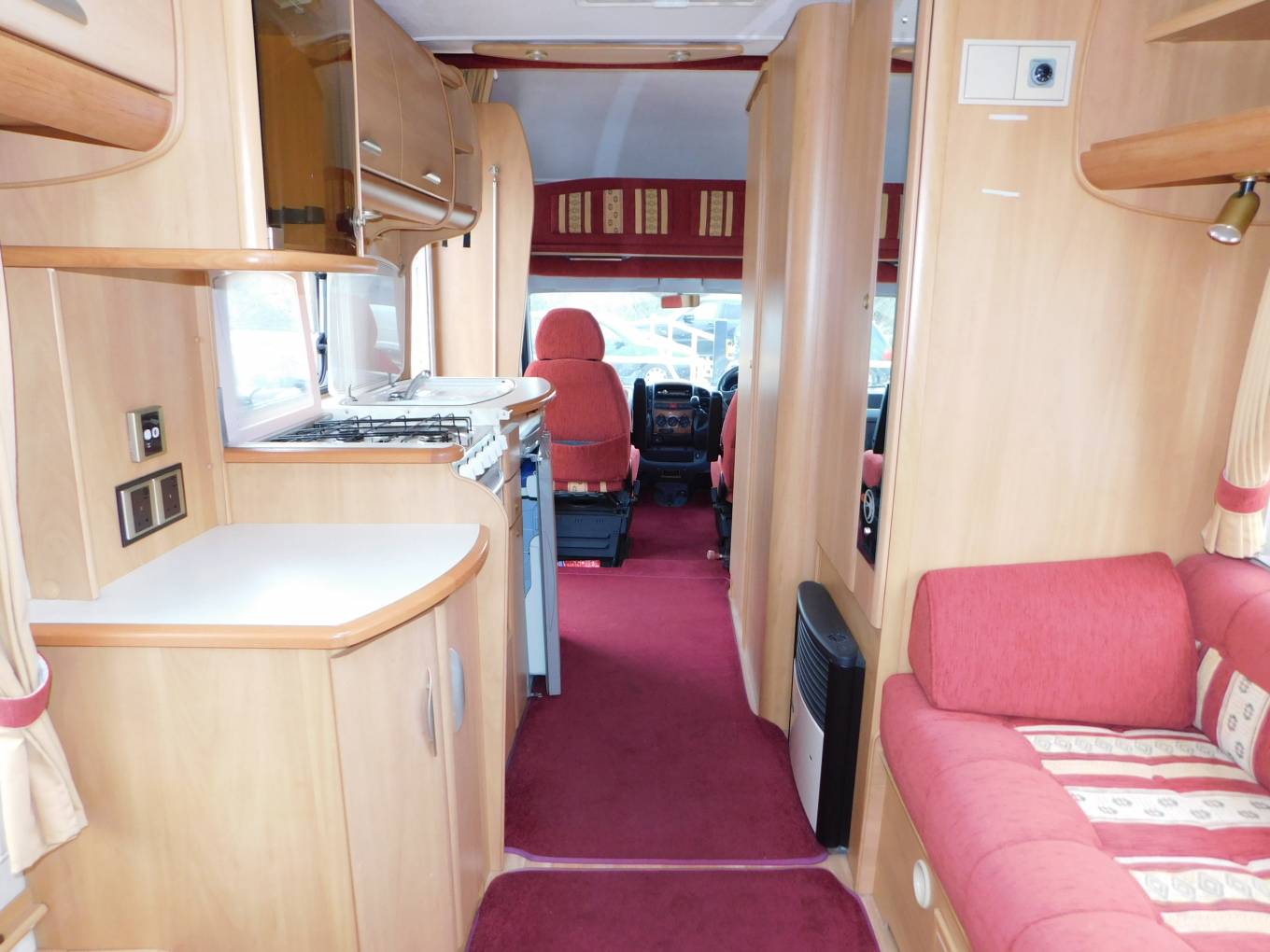 Using the electric step to enter, you have the kitchen to your right, with a very large sink with draining board, pop-up mixer tap and fold-up glass lid. A four gas burner hob with glass lid, a gas grill and oven beneath. There is an Electrolux three-way powered fridge with ice-box, plus plenty of upper and lower cabinets to store away your holiday provisions.