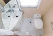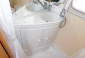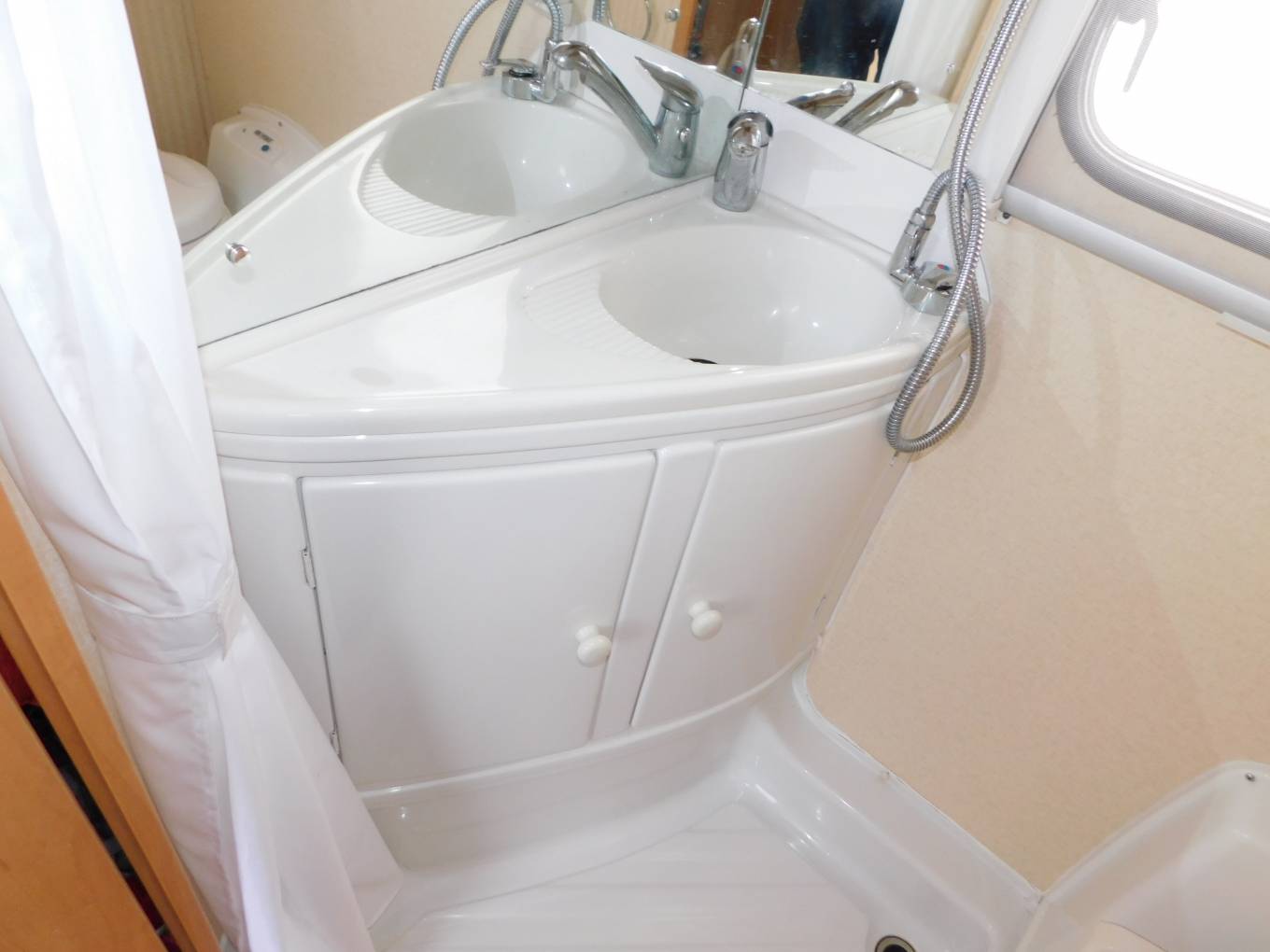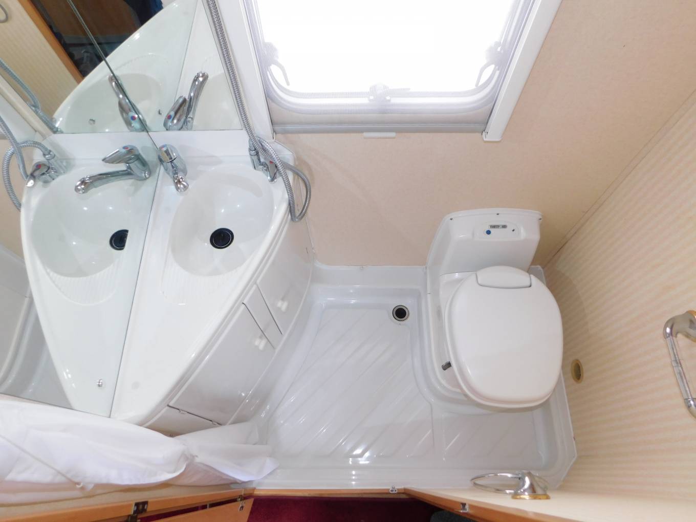 The washroom has a good sized shower tray with a rising rail, shower handset and separate mixer tap. The washbasin has a chrome mixer tap and storage cabinet below with mirror above, there is a further storage cabinet mounted above the toilet, plus a Thetford cassette swivelling toilet with electric flush.