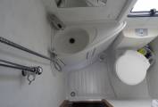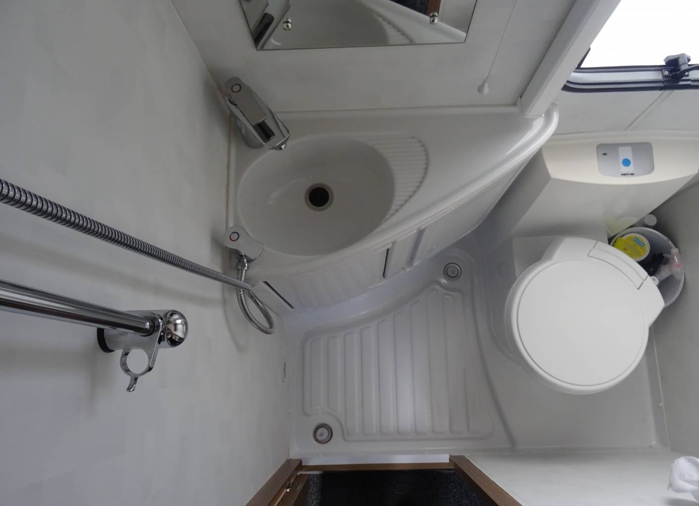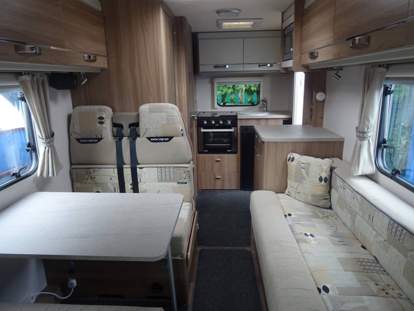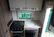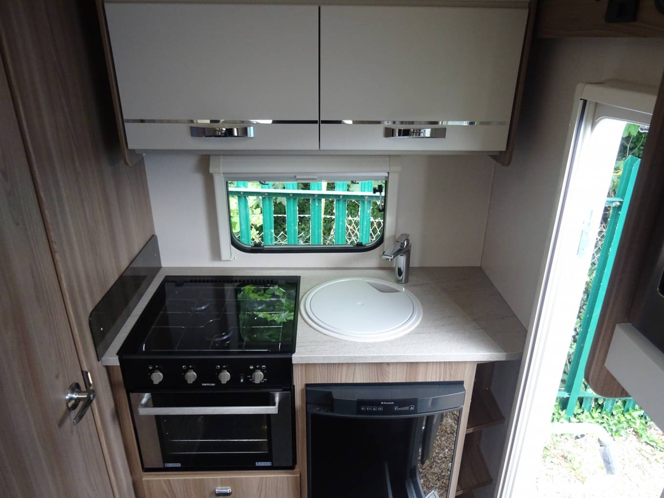 We have a traditional layout with the end kitchen - 3 burner gas hob, oven/grill, Dometic 3 way fridge, sink and mixer tap. There is good storage above and below and a two way fan. Also at the rear is the washroom, with shower, basin, electric flush toilet, high and low storage, and mirror.