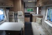 Next up is a spacious hanger wardrobe, with more storage space below, this stores a second table. Opposite this is a work station, with lots of good storage, making for a great set up with its close proximity to the cooker and fridge. We have 12 and 240v sockets, TV and a microwave above. The lounge/dinette is very popular and traditional. On the nearside we have the long settee with facing double seats and table on the other side. Front facing seats are belted (inertia). The long settee will sleep one and the dinette area very easily converts to a double measuring 6ft by 4ft at its maximum. We have over head storage units on both sides, with strip multi coloured mood lighting, and a secondary DAB stereo set up with fitted speakers.