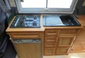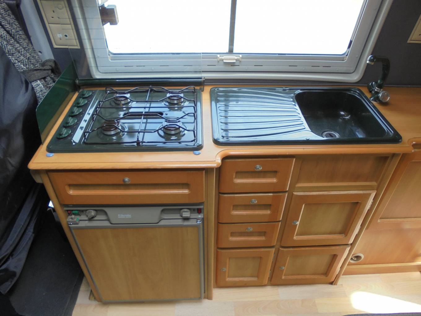 Kitchen has fridge with freezer compartment which operate on gas or electric, grill, 4x gas burner and sink. Washroom has sink, shower and toilet. Other features include leisure battery, electric hook up, 230v power points, swivel passenger seat. Hot water and heating via gas or electric.