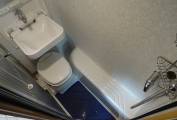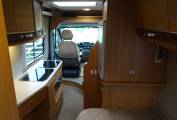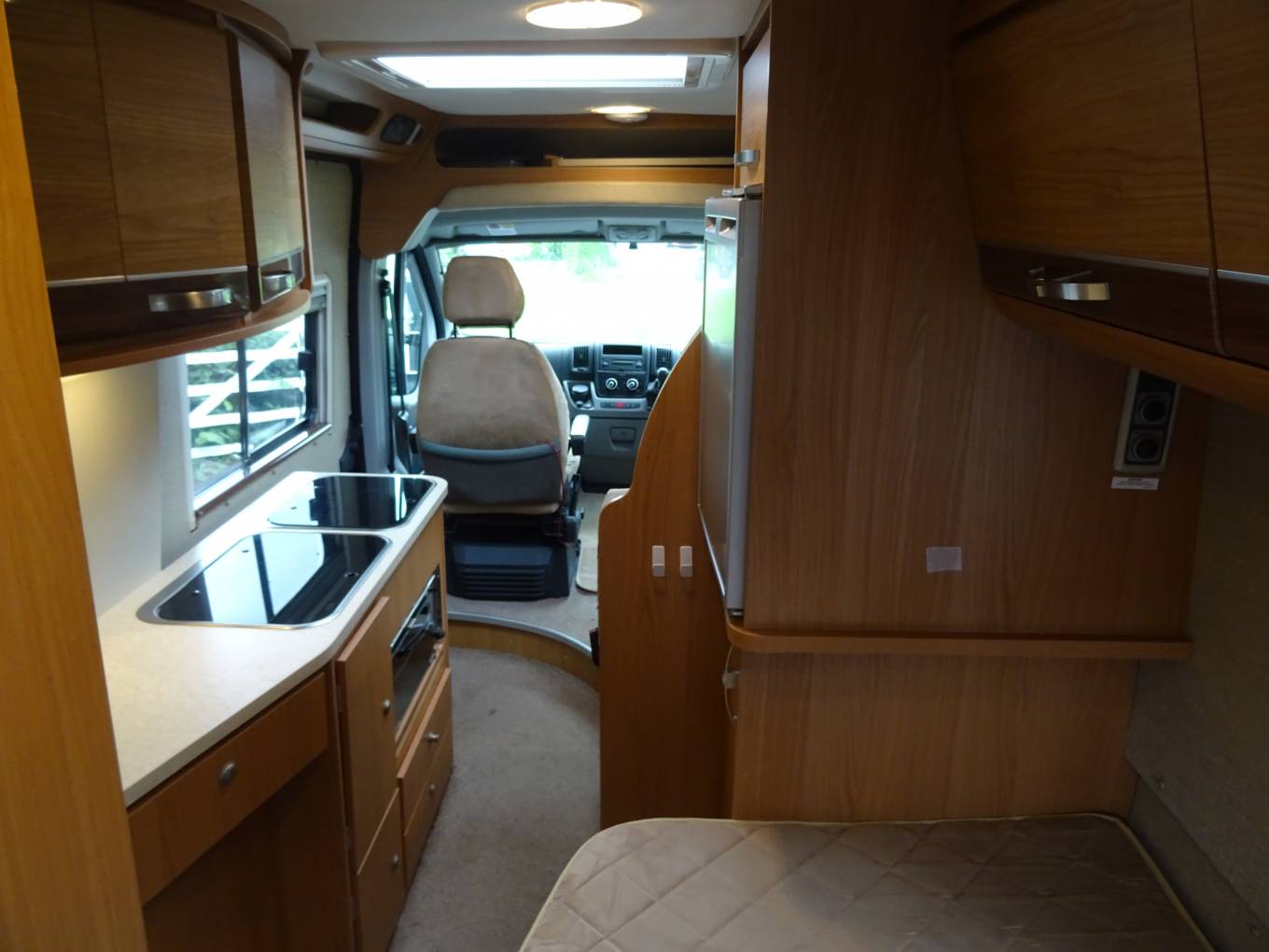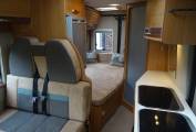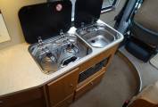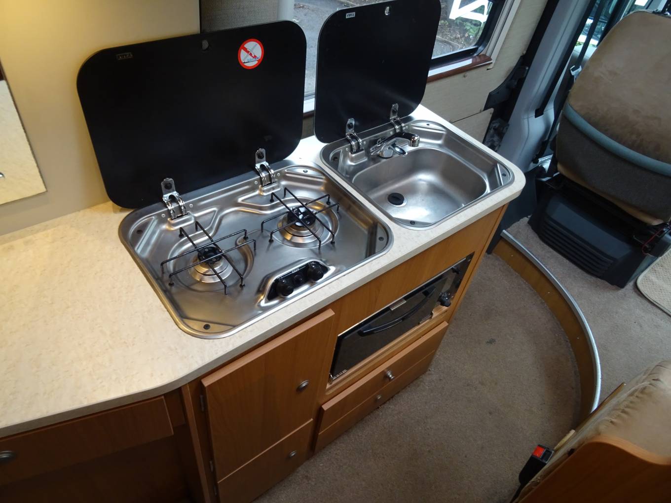 Moving through to the centre of the motorhome, we come to the kitchen area where there is plenty of appliances and space to rustle up a lovely hot meal. This includes a Waeco fridge with freezer compartment, a 2 ring gas hob and grill supplied from the refillable gas bottles located in the exterior storage unit along with a portable electric oven which is included in the sale. Adjacent to the cooker is the washbasin with mixer tap accompanied by further storage cupboards and drawers underneath.