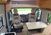 As we head towards the front of the motorhome, we come to the lounge/dining area where there are the rear two travelling seats which along with the drivers seat make the additional single bed. At the front, both driver and passenger seats swivel to face the large dining table that is positioned in between that offers that warm family dining experience.